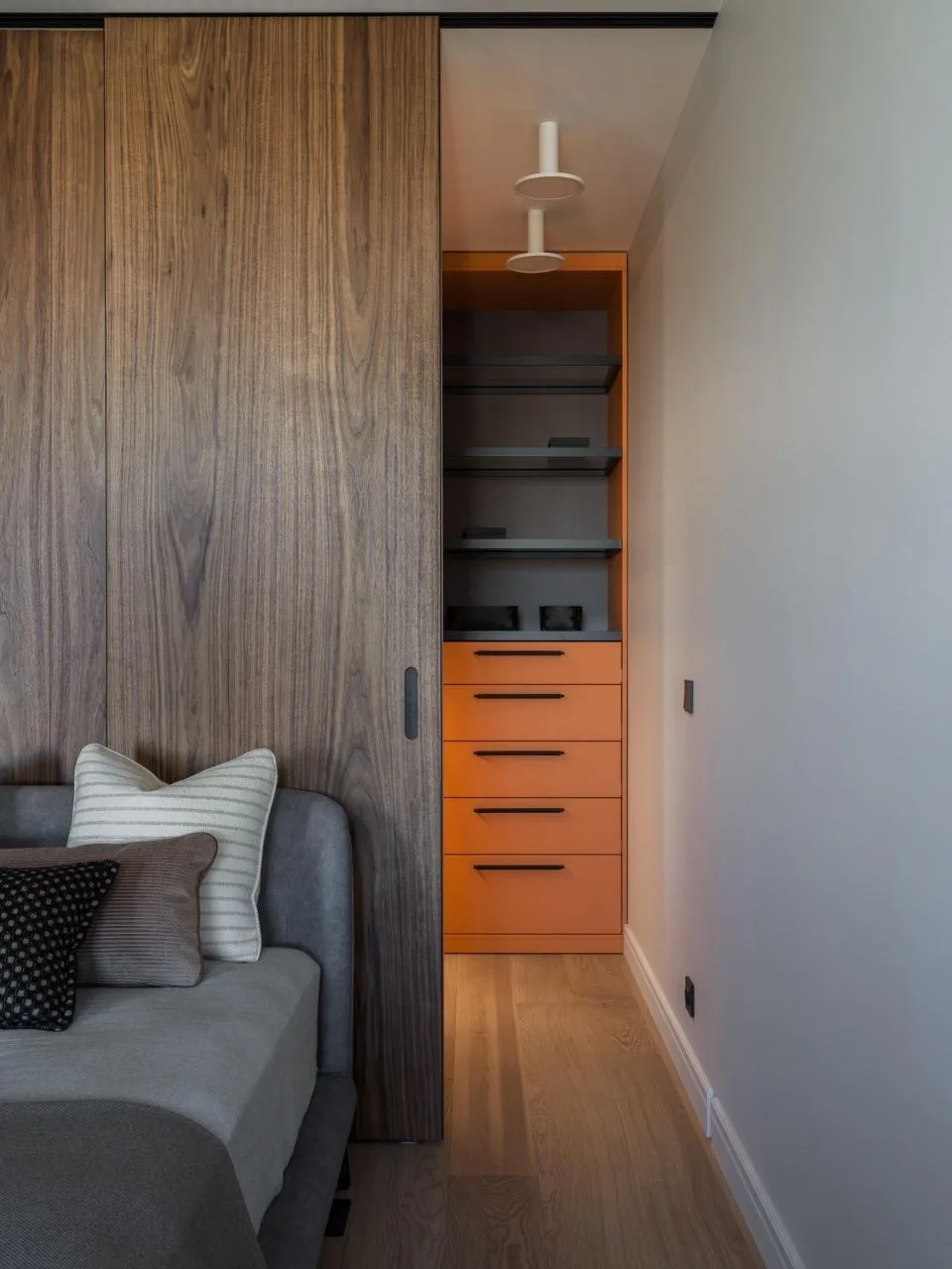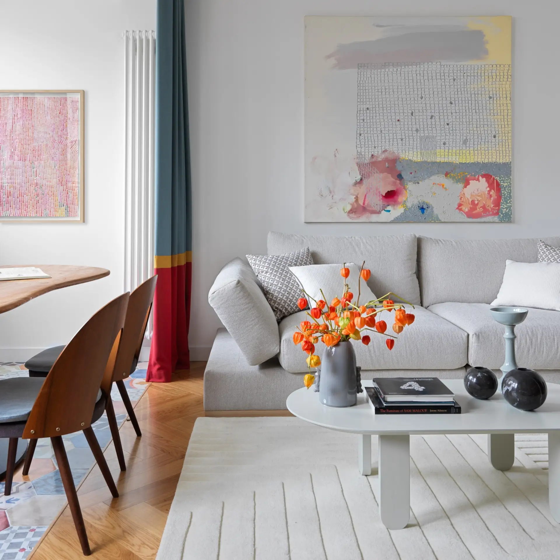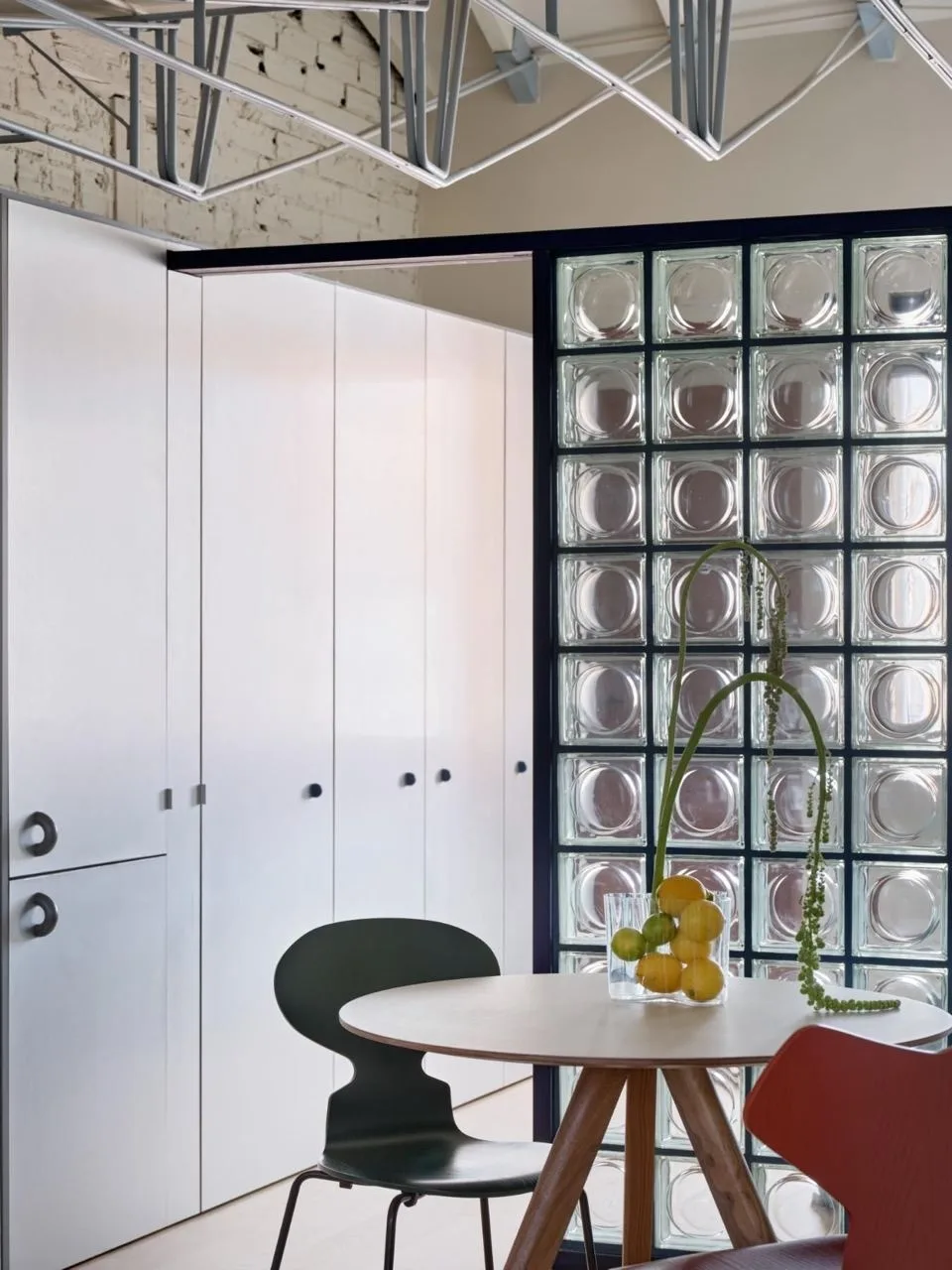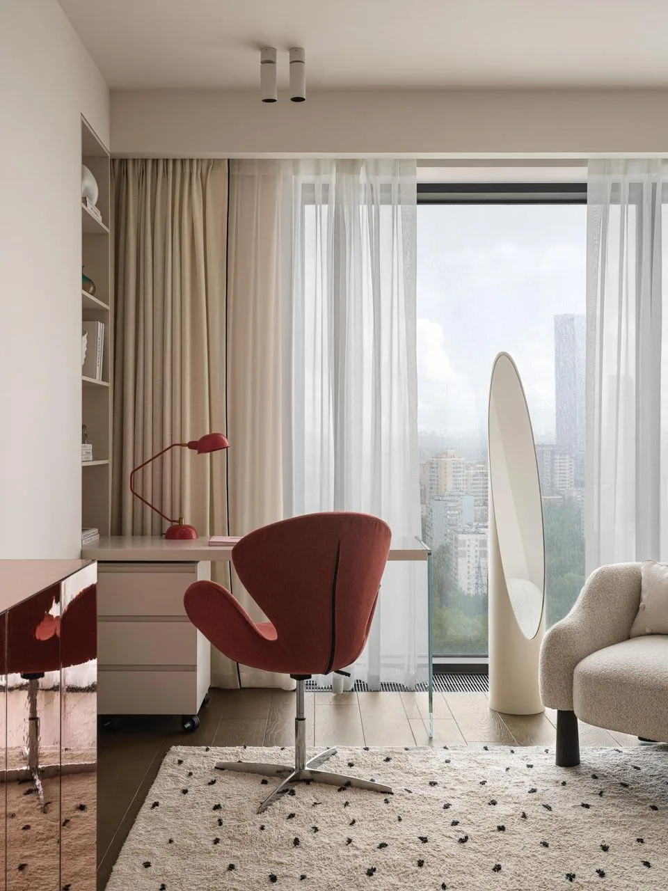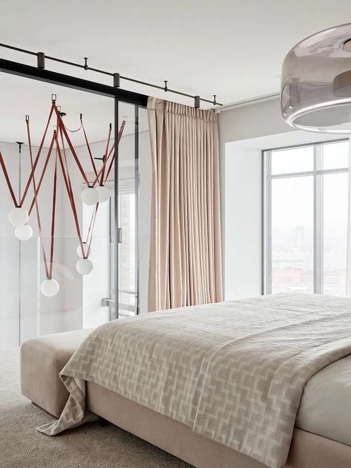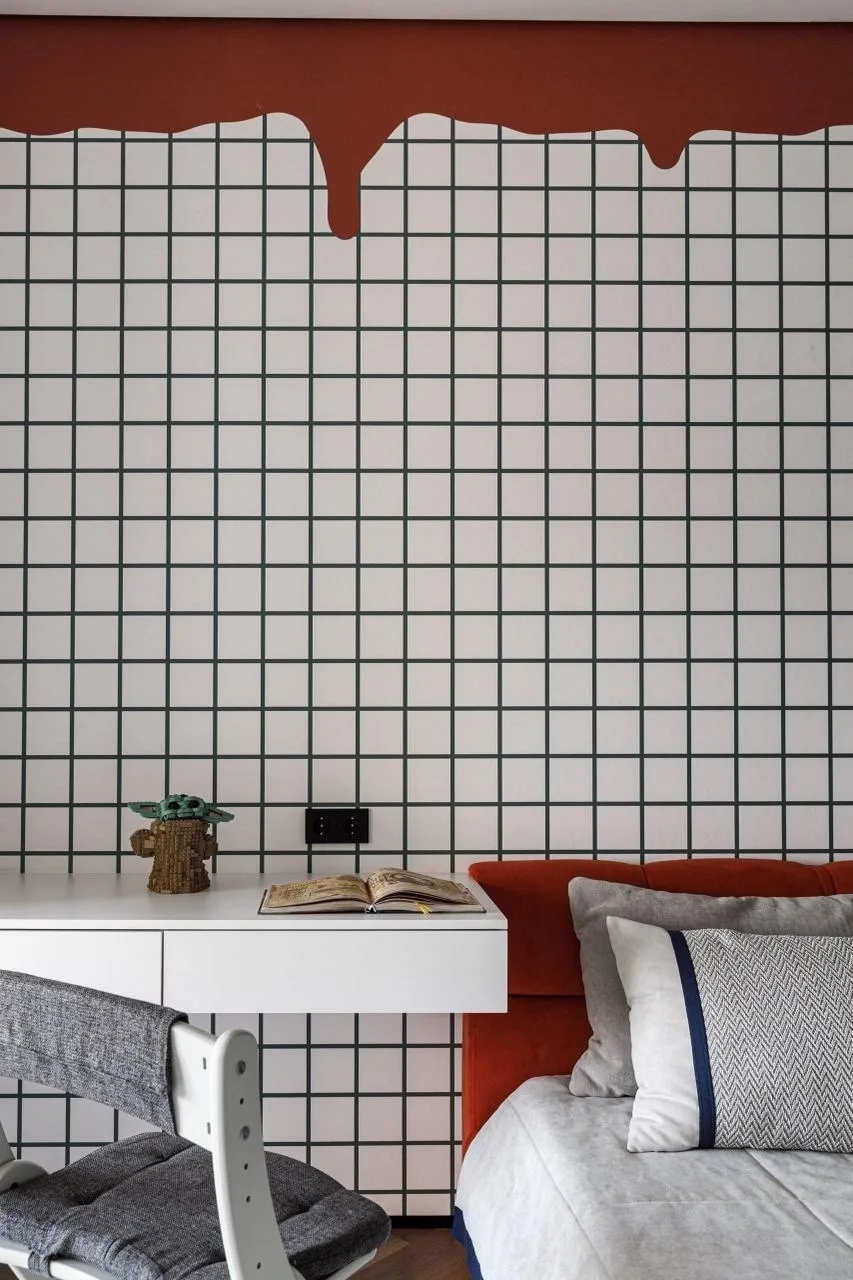 Цветовая гамма квартиры строится на игре противоположностей. Архитекторы называют это «дуальностью» — своеобразным перетягиванием каната между спокойствием и драматической насыщенностью. Основу составляют мягкие, светлые нейтральные тона, которые неожиданно прерываются яркими цветовыми акцентами.