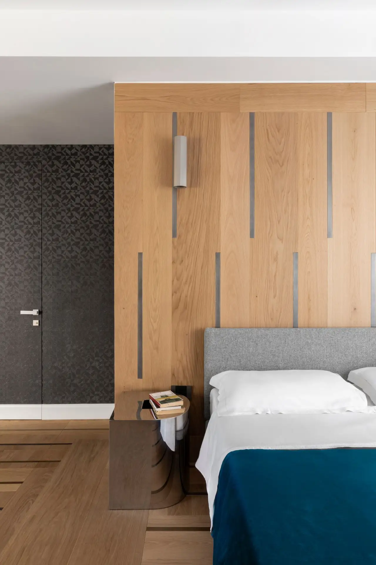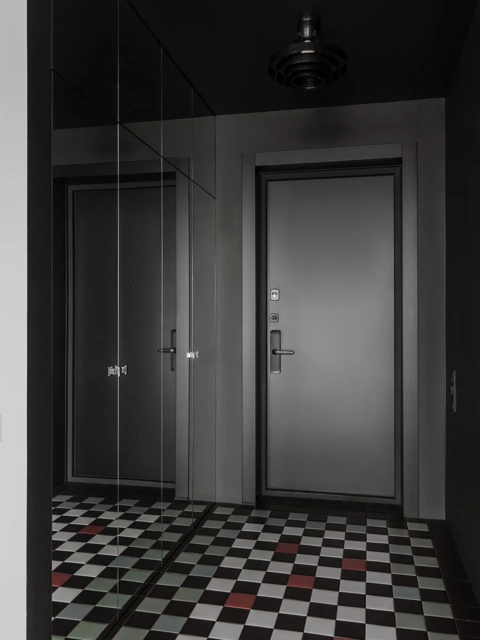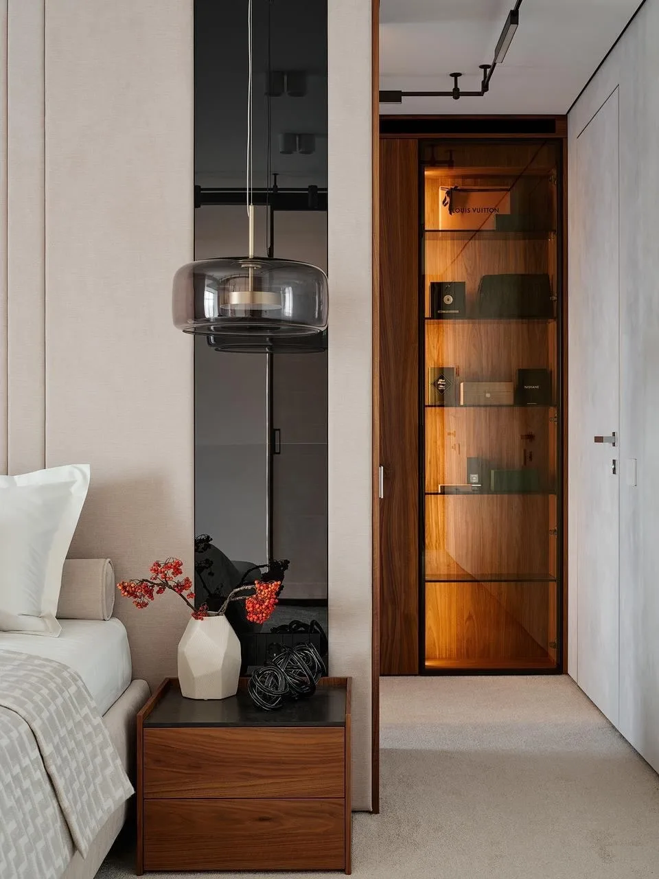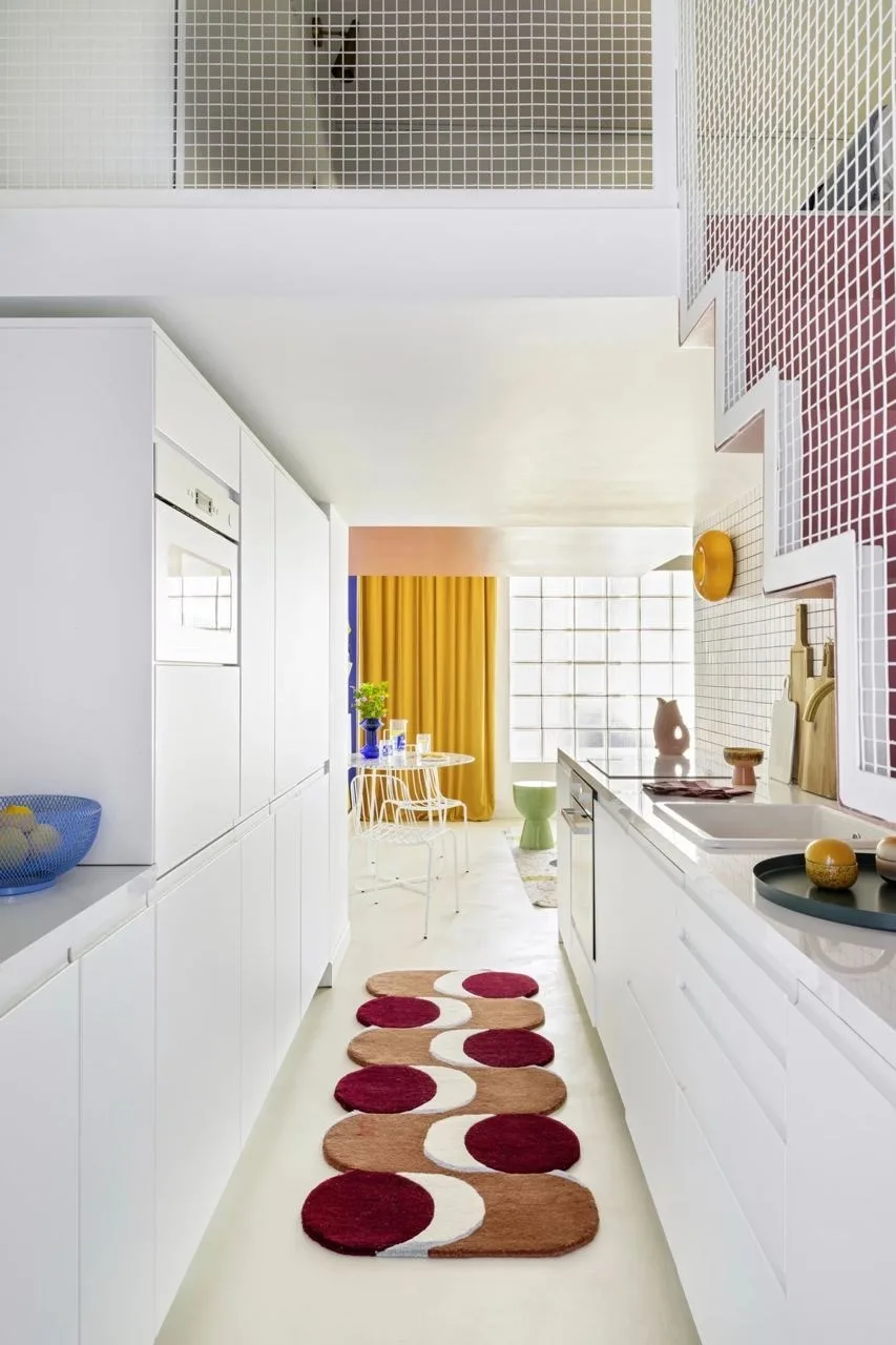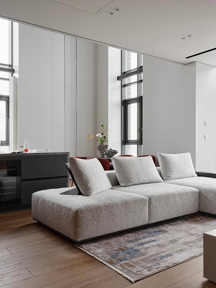 Цветовая гамма квартиры строится на игре противоположностей. Архитекторы называют это «дуальностью» — своеобразным перетягиванием каната между спокойствием и драматической насыщенностью. Основу составляют мягкие, светлые нейтральные тона, которые неожиданно прерываются яркими цветовыми акцентами.