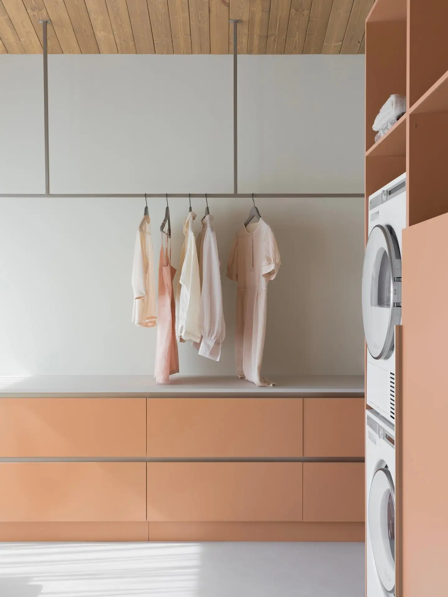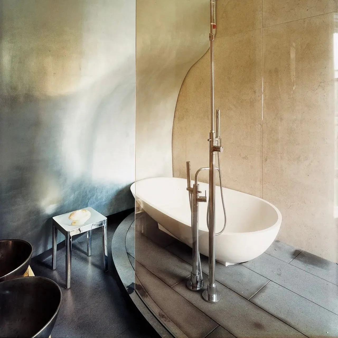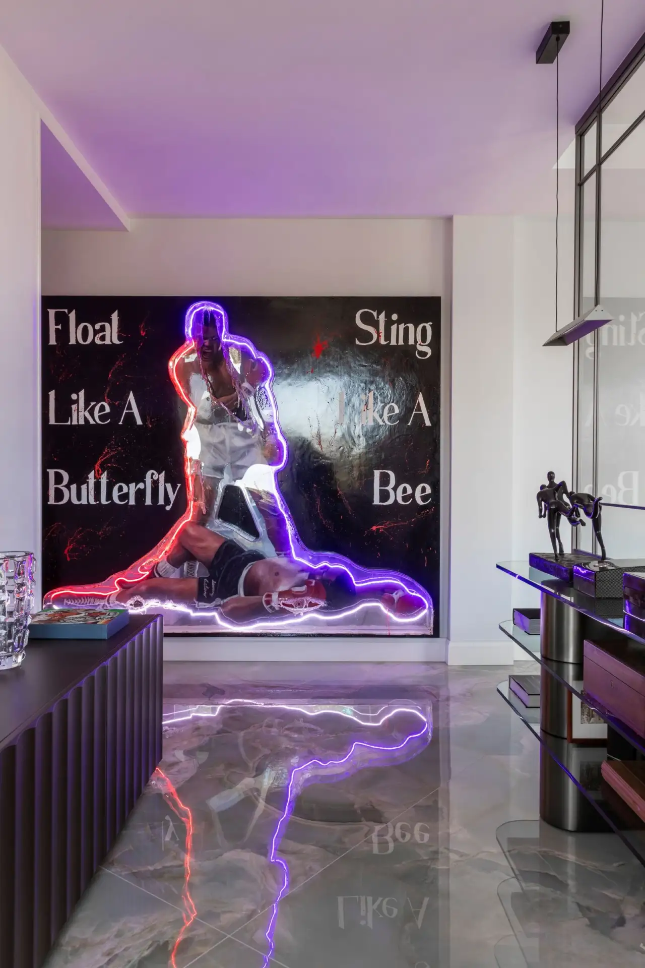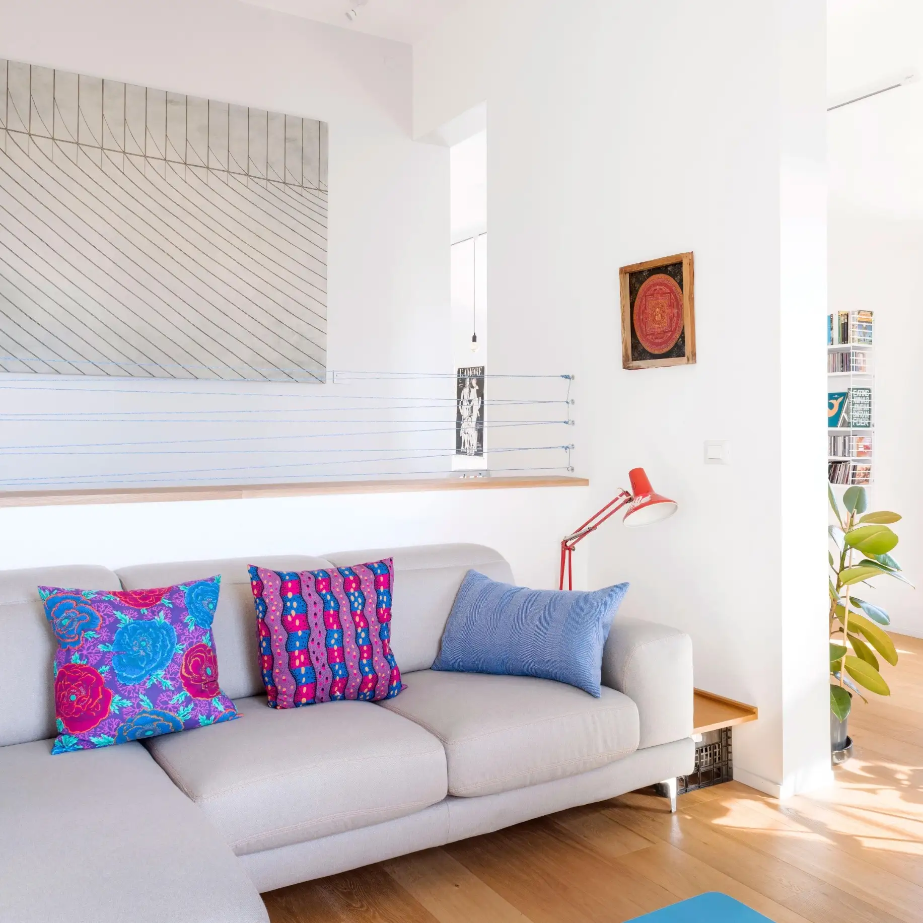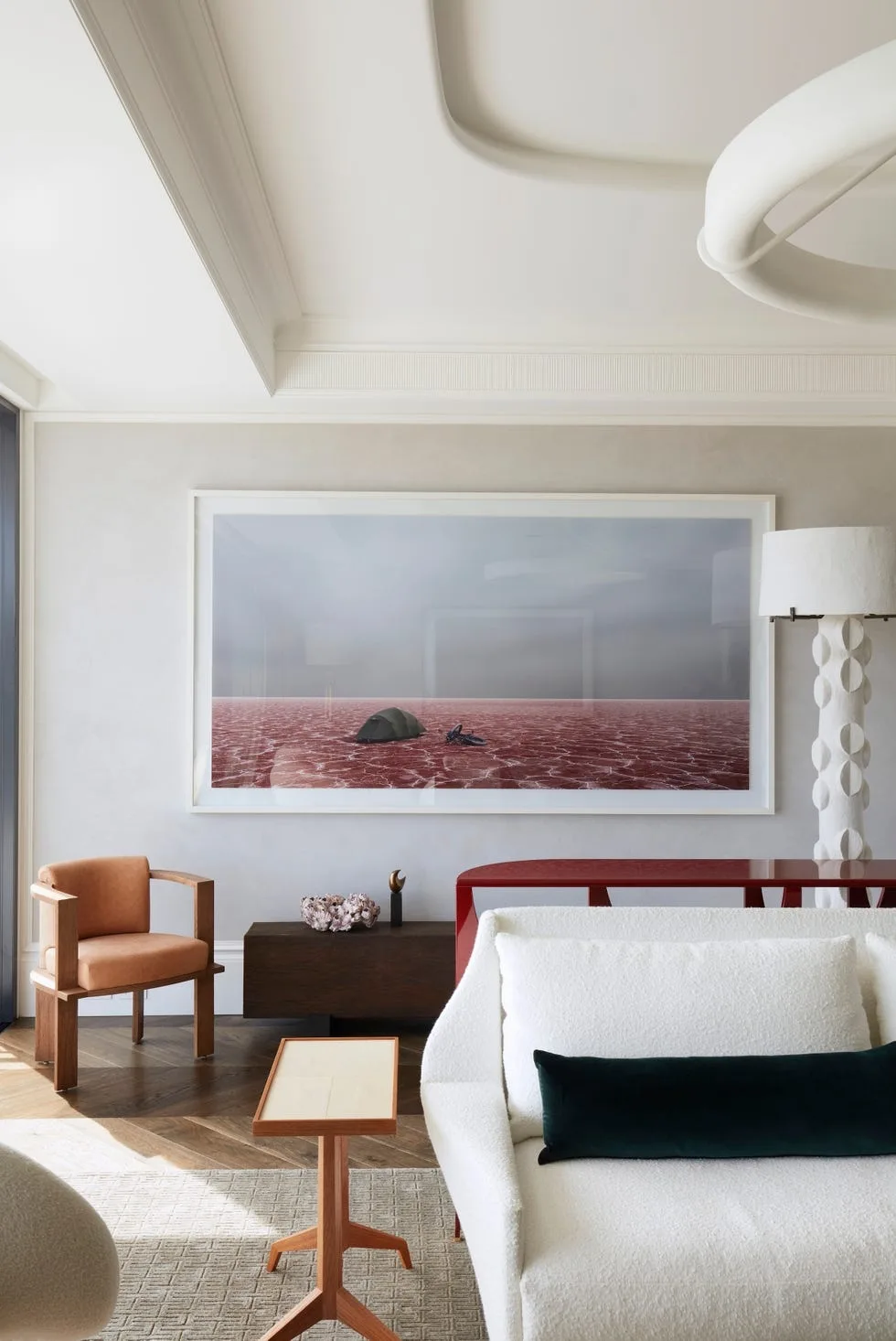 Цветовая гамма квартиры строится на игре противоположностей. Архитекторы называют это «дуальностью» — своеобразным перетягиванием каната между спокойствием и драматической насыщенностью. Основу составляют мягкие, светлые нейтральные тона, которые неожиданно прерываются яркими цветовыми акцентами.