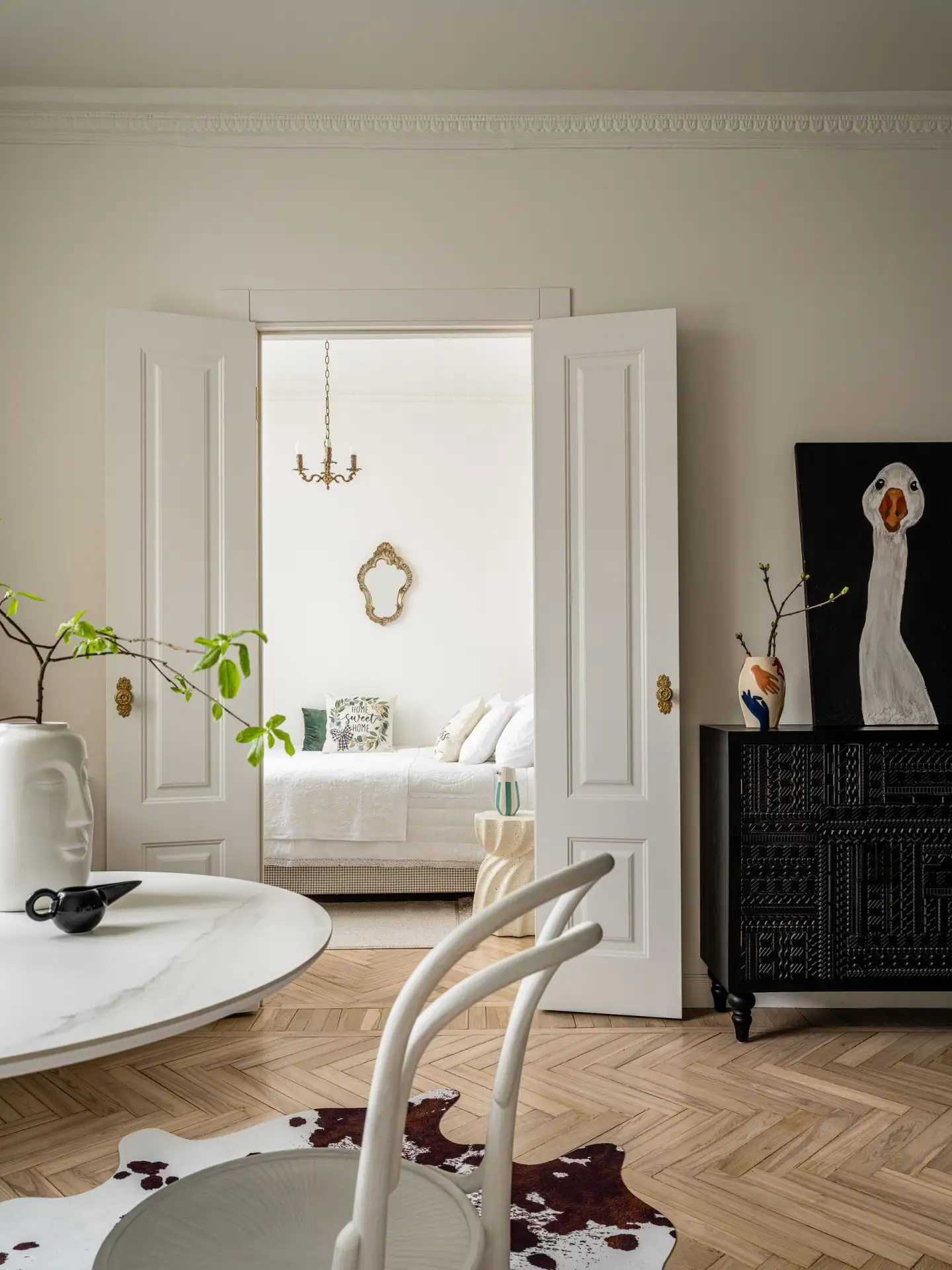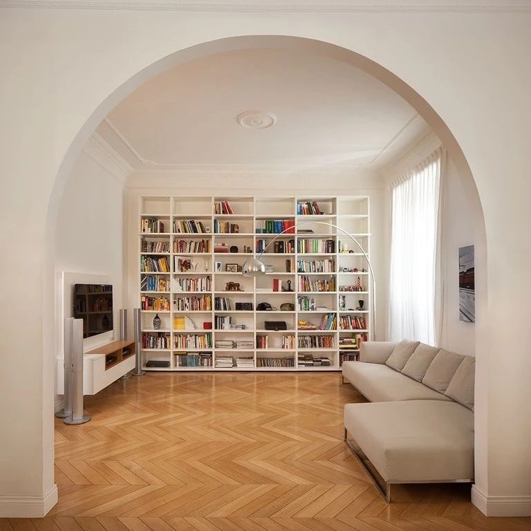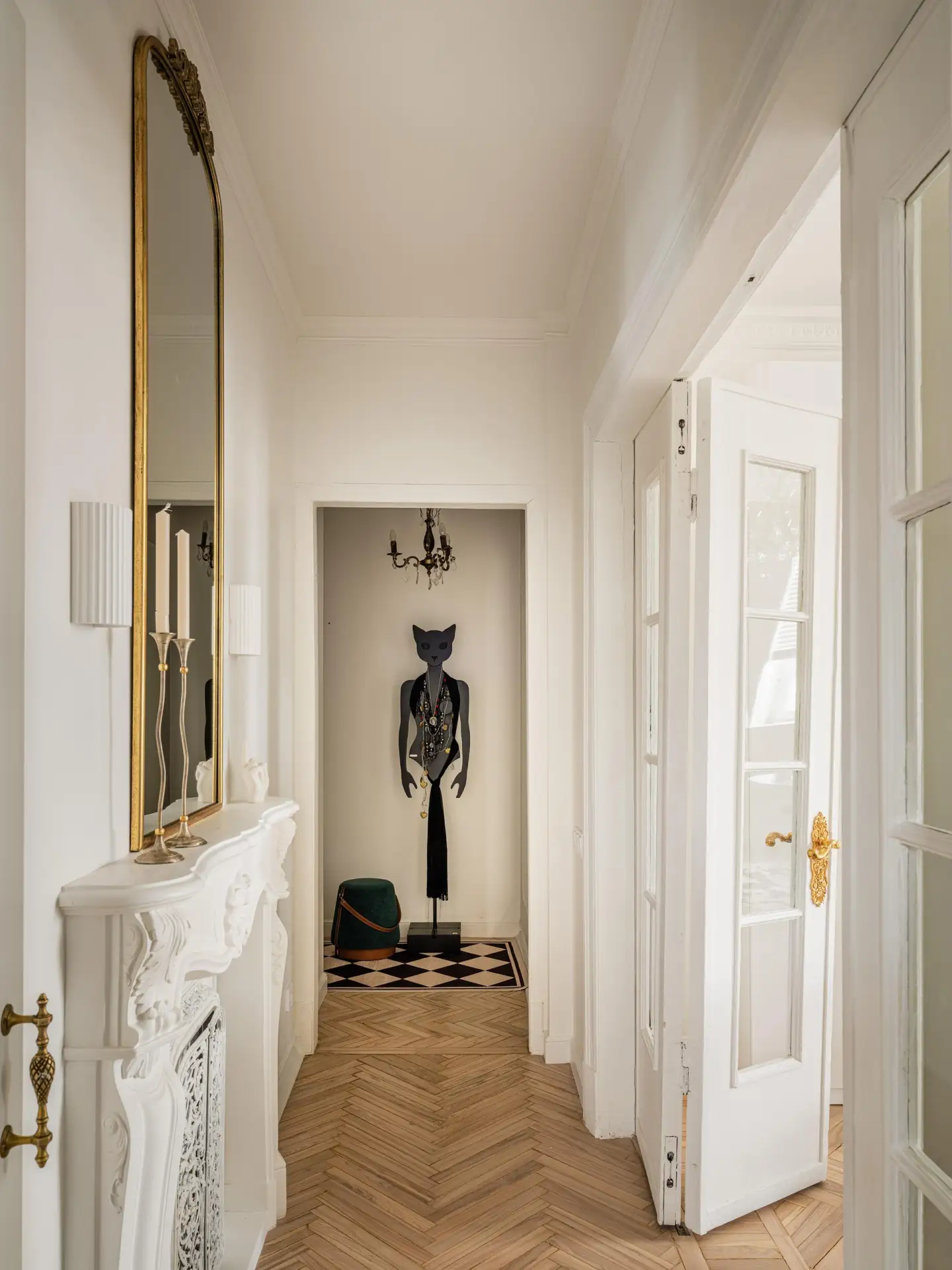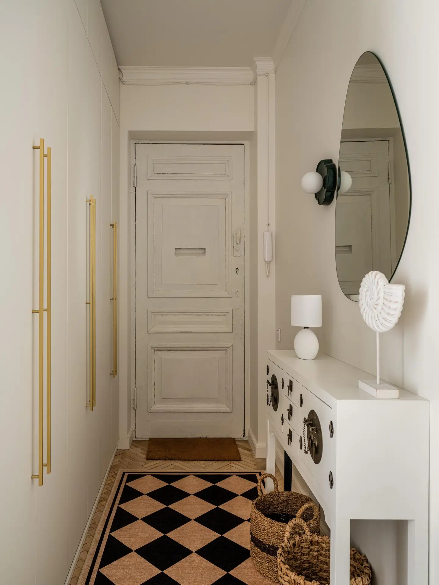 Вход в квартиру напоминает музейную галерею: длинный коридор, высокий потолок с лепниной. Вдоль стен — табуреты и столы, которые Тухами спроектировал сам. Их геометрические формы из белого дуба контрастируют с историческим окружением.