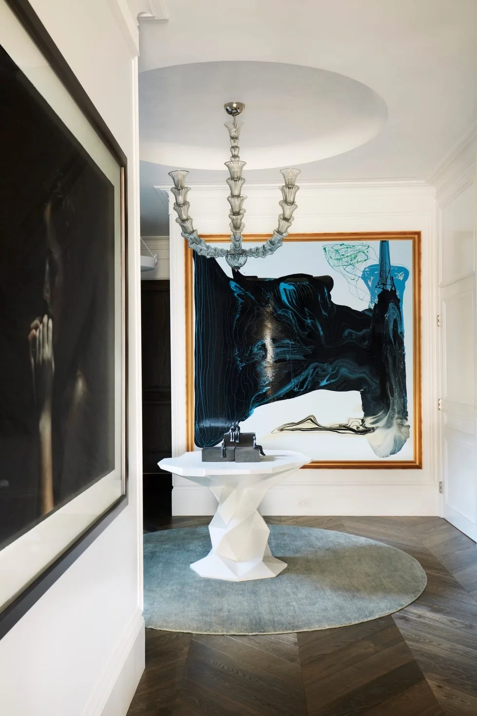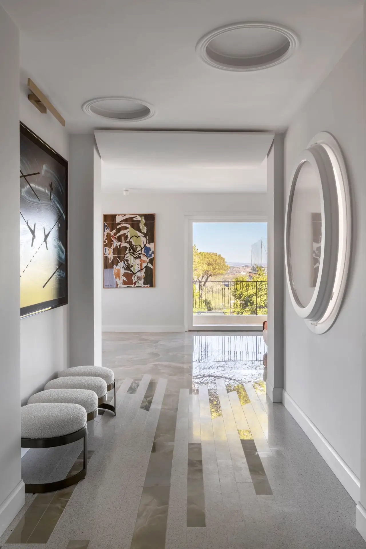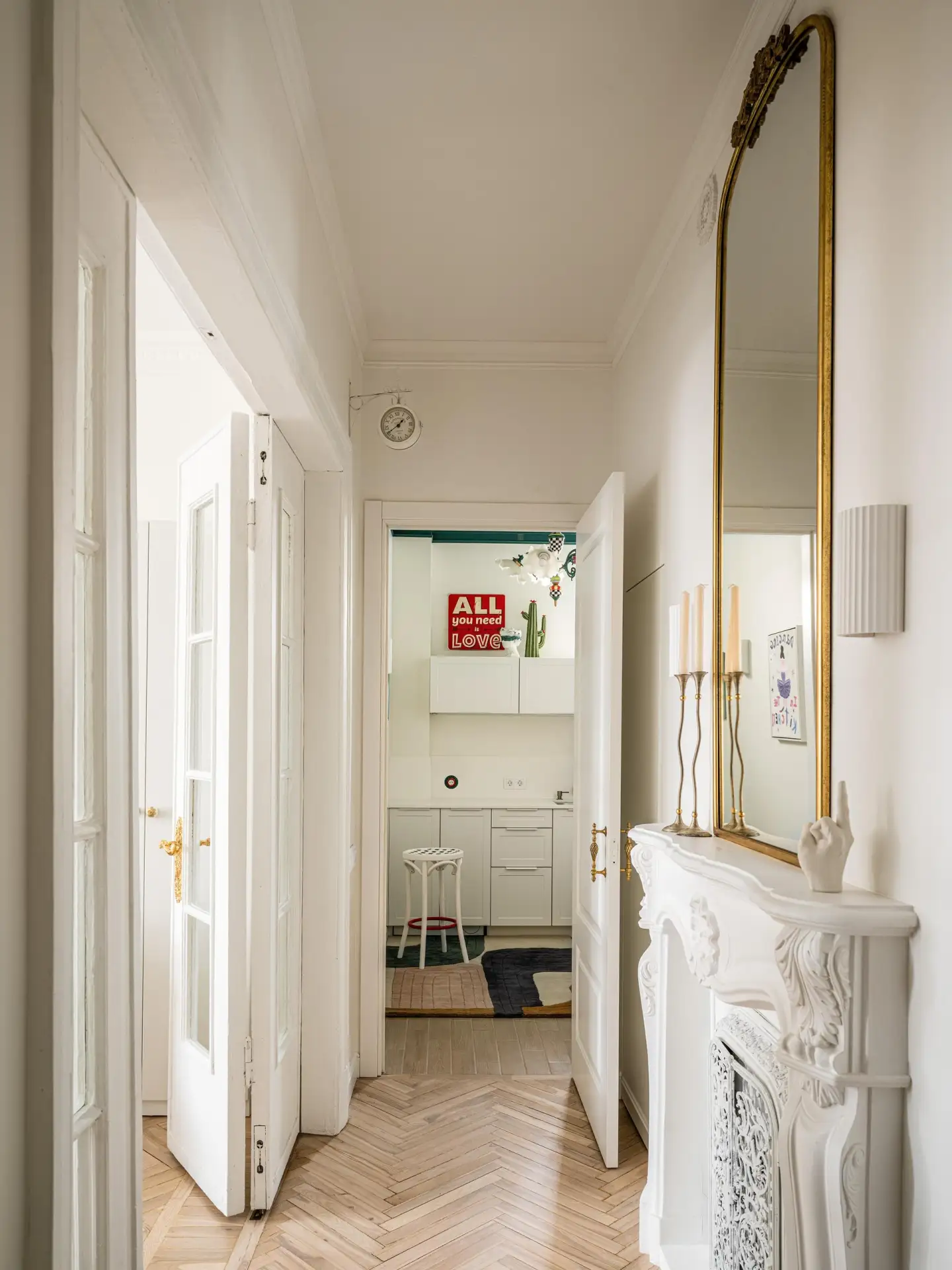 Вход в квартиру напоминает музейную галерею: длинный коридор, высокий потолок с лепниной. Вдоль стен — табуреты и столы, которые Тухами спроектировал сам. Их геометрические формы из белого дуба контрастируют с историческим окружением.
