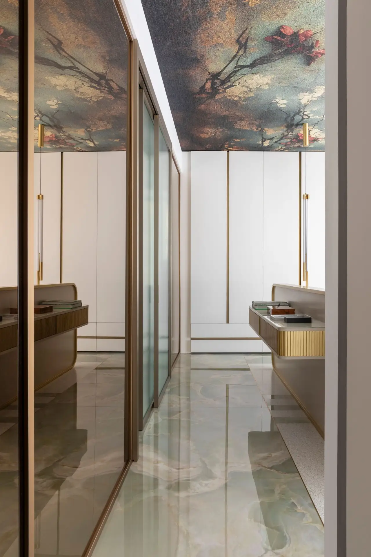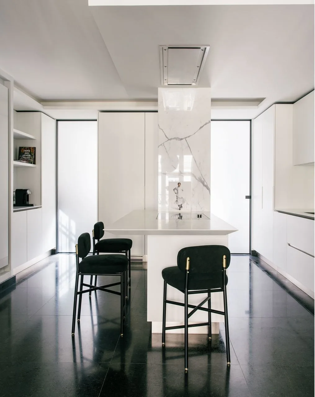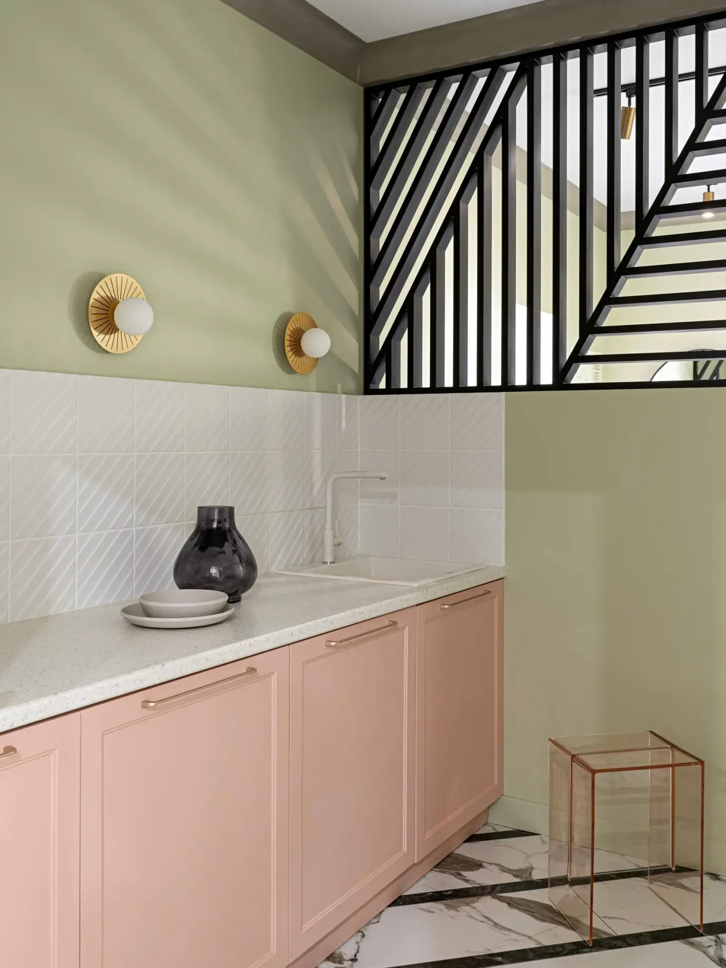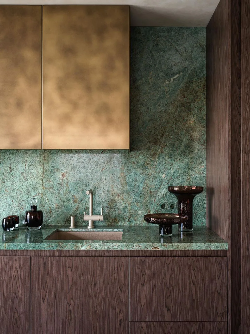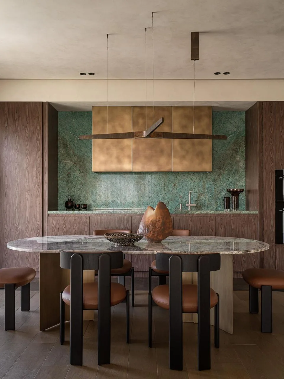 Центральным материалом стал гватемальский зеленый оникс, дополненный светлой инкрустацией — отсылка к оригинальной отделке дома. Его использовали для полов, и он стал связующим звеном между интерьером и видом за окном.