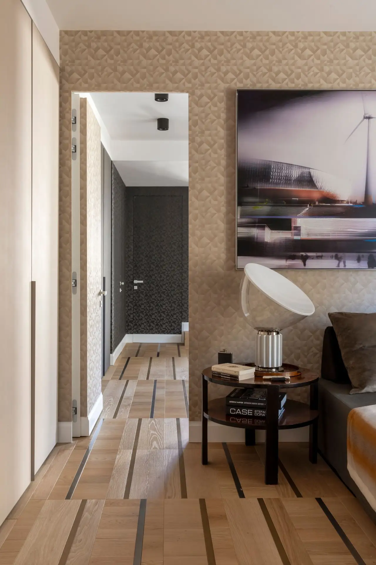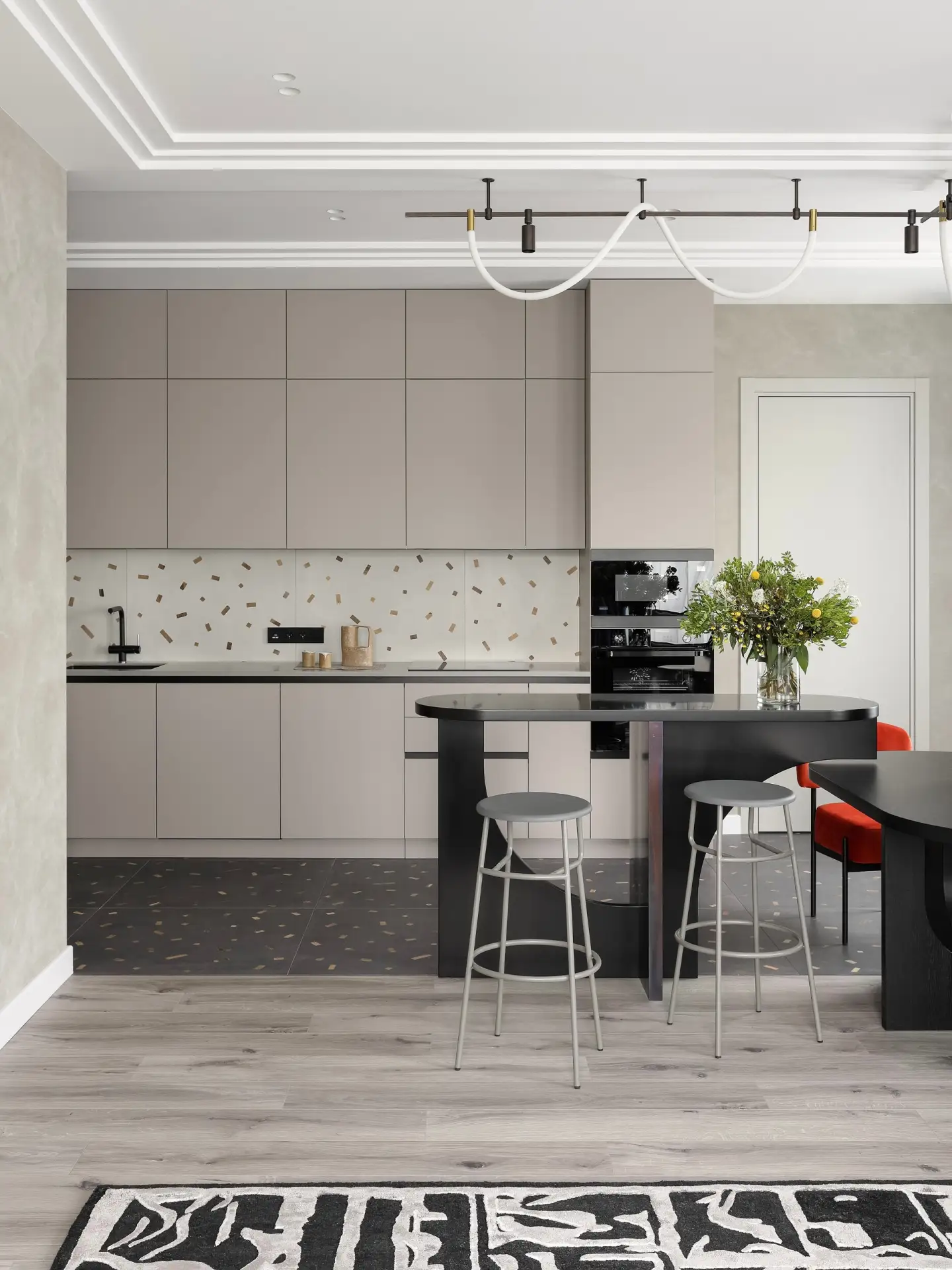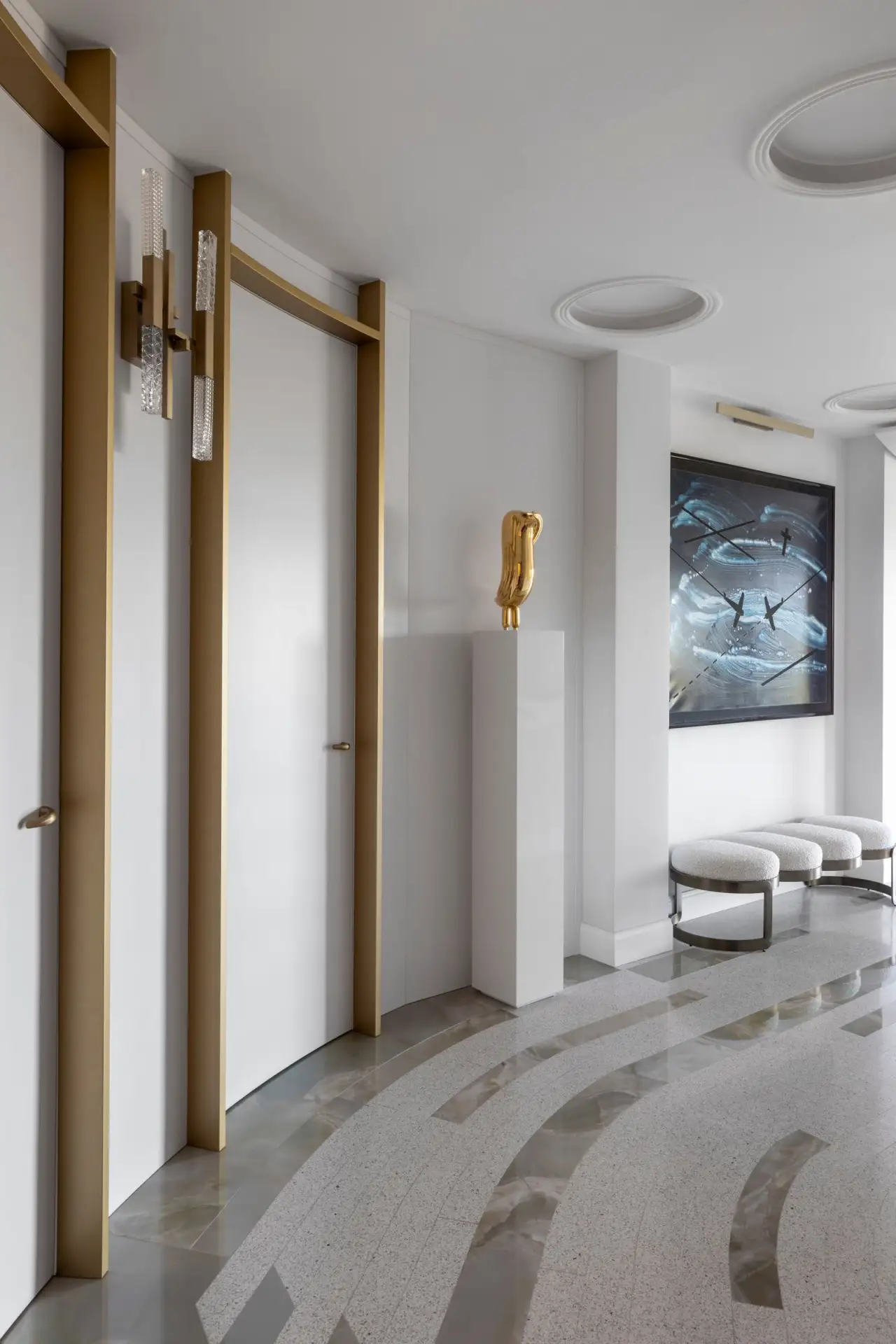 При всем обилии деталей интерьер выглядит спокойным, мягким, не давящим. Все благодаря балансу: контрастный пол уравновешивают нейтральные стены и потолок, а мебельную фурнитуру и искусство дизайнеры подбирали в рифму к вкраплениям керамогранита.
