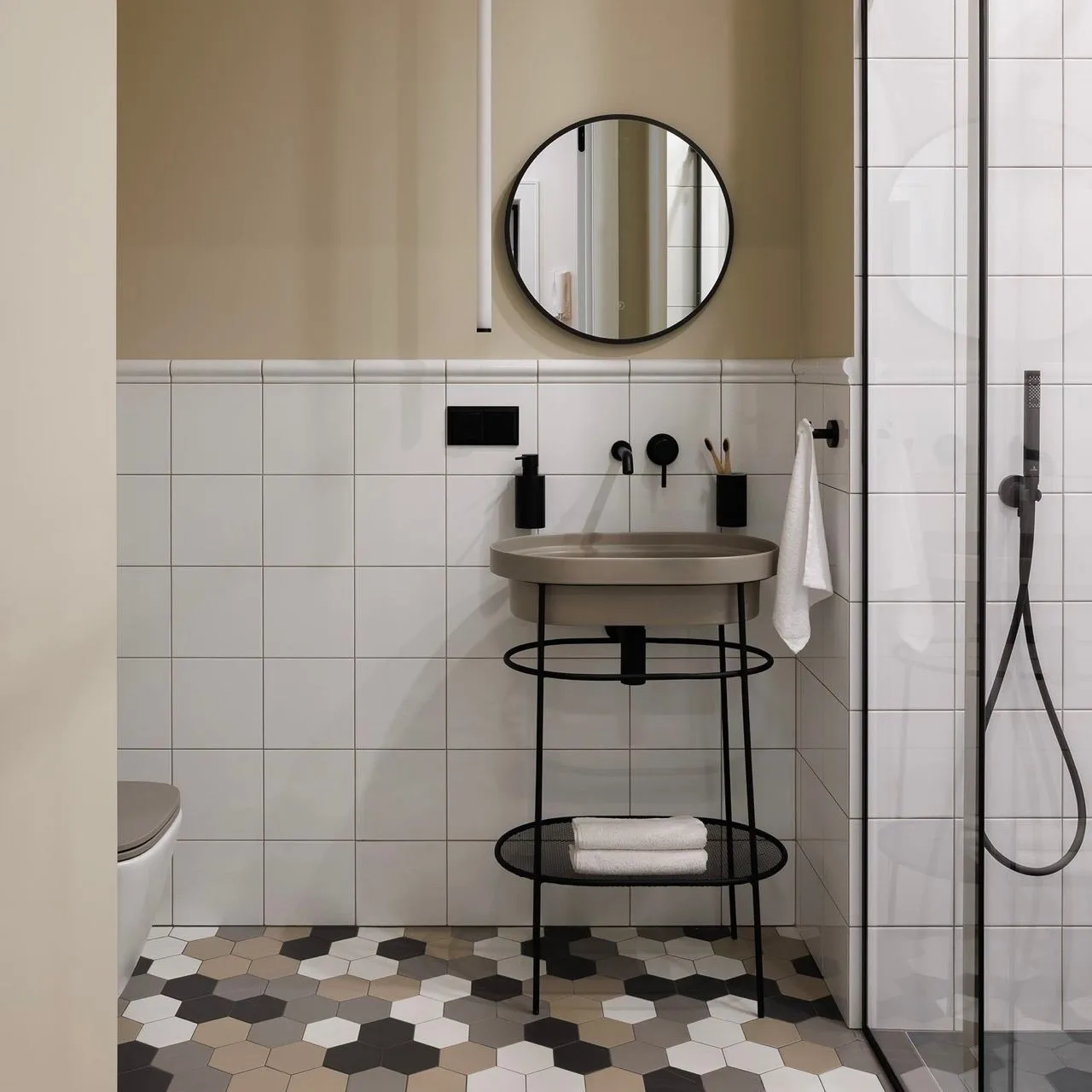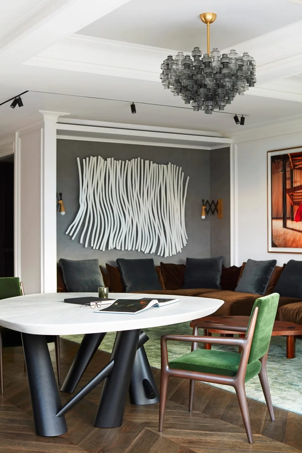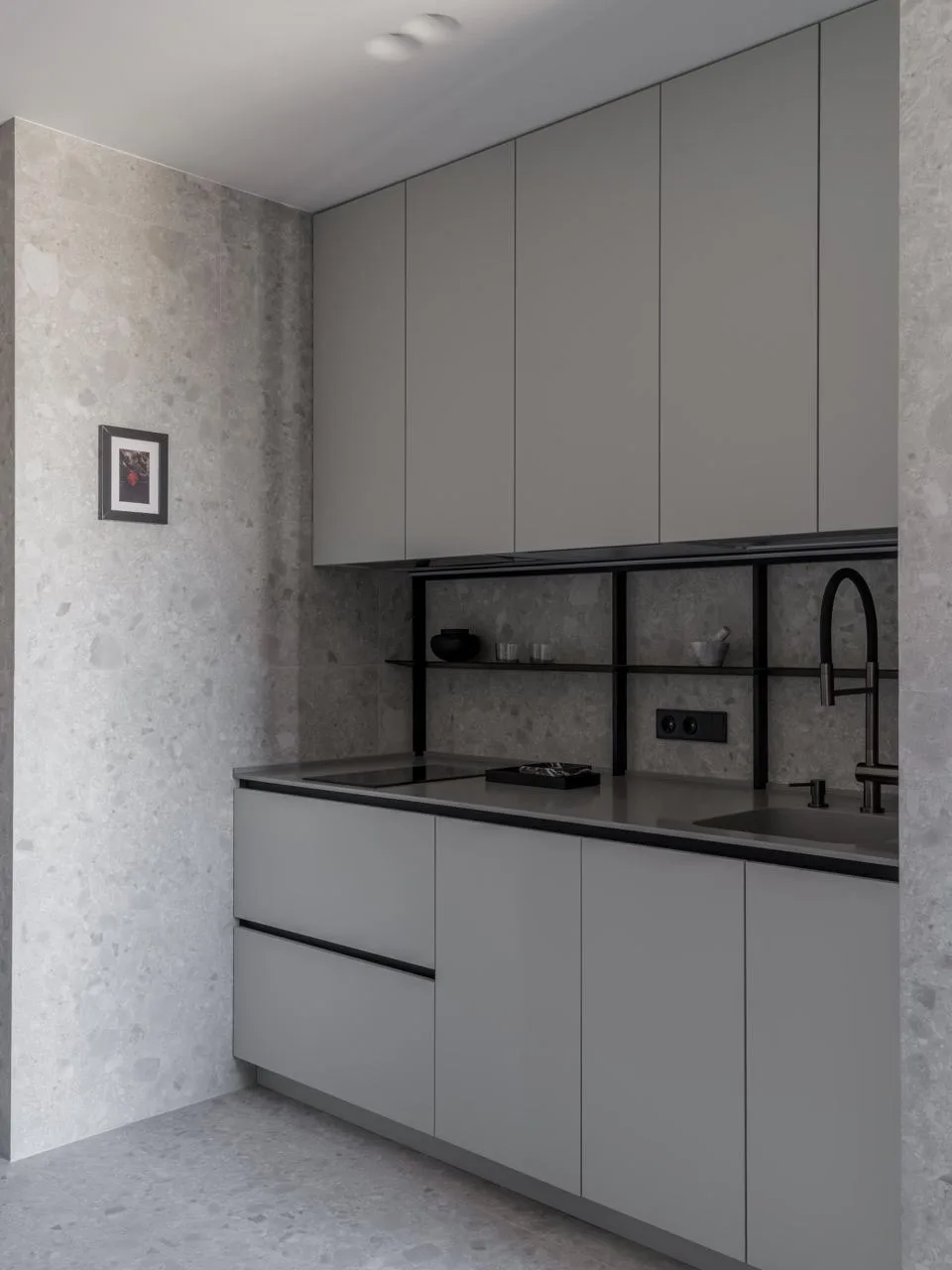 При всем обилии деталей интерьер выглядит спокойным, мягким, не давящим. Все благодаря балансу: контрастный пол уравновешивают нейтральные стены и потолок, а мебельную фурнитуру и искусство дизайнеры подбирали в рифму к вкраплениям керамогранита.