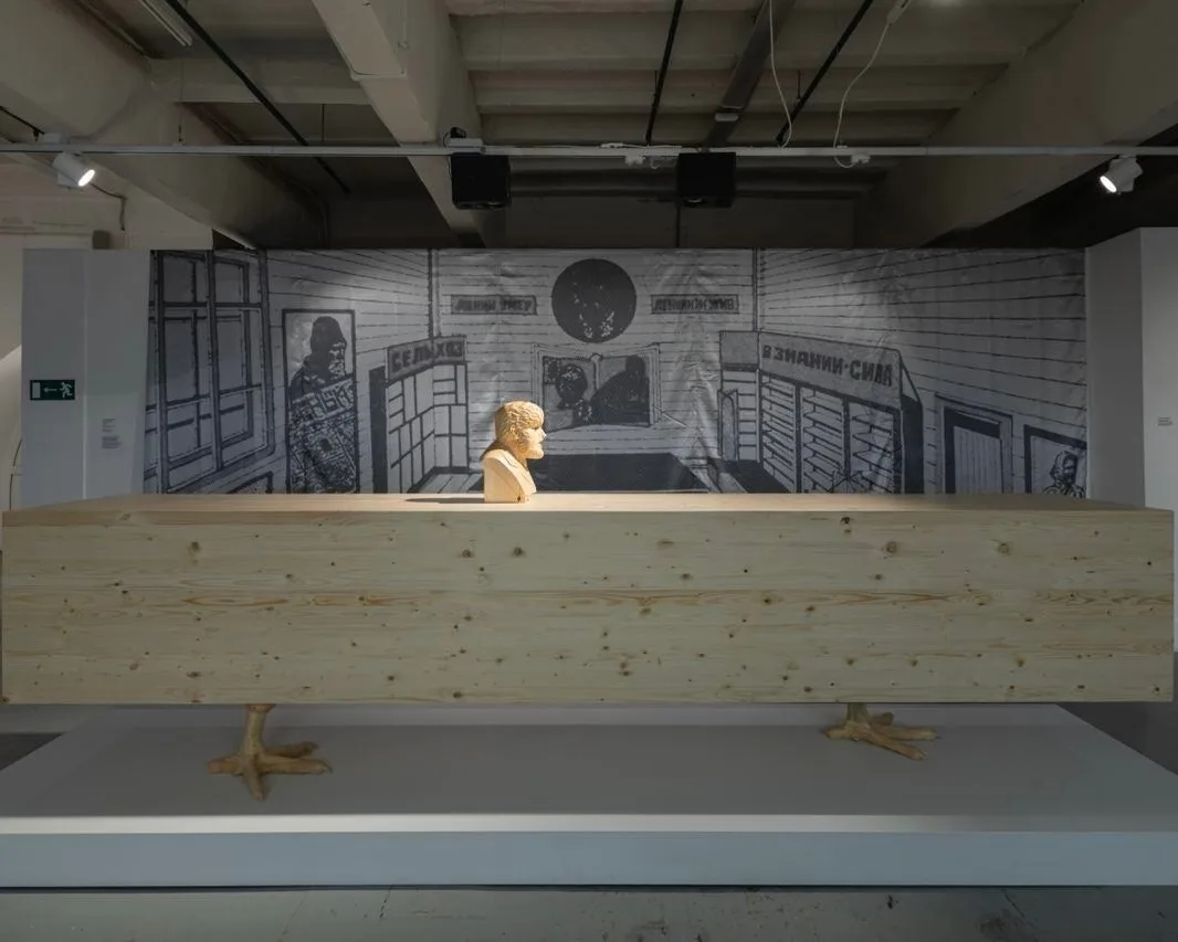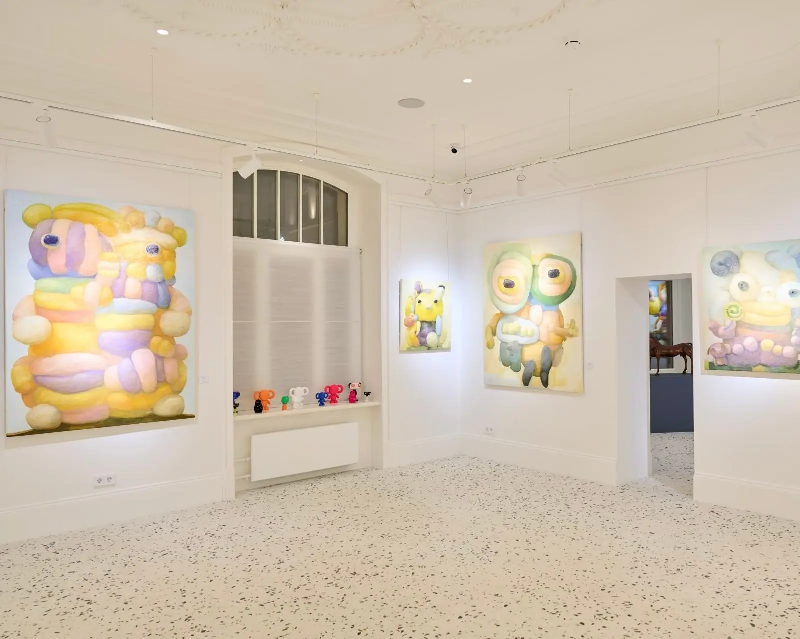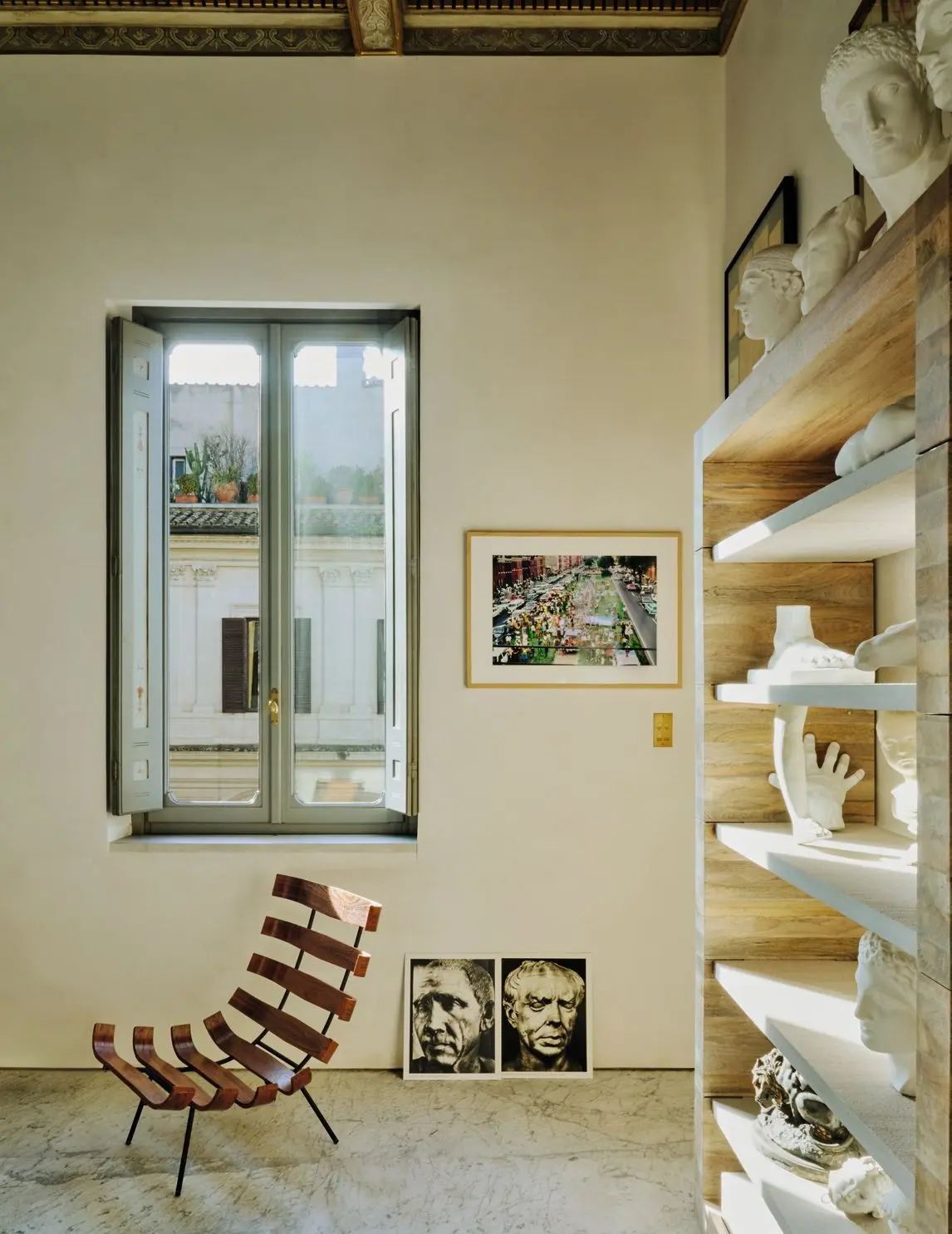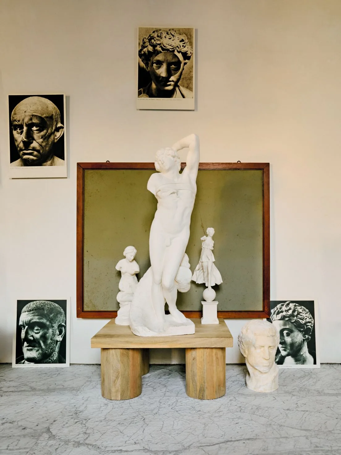 По всей длине прихожей и на стенах разложены страницы из книги Roman Portraits. Здесь же — гипсовые фигуры и бюсты, сделанные студентами местной художественной академии