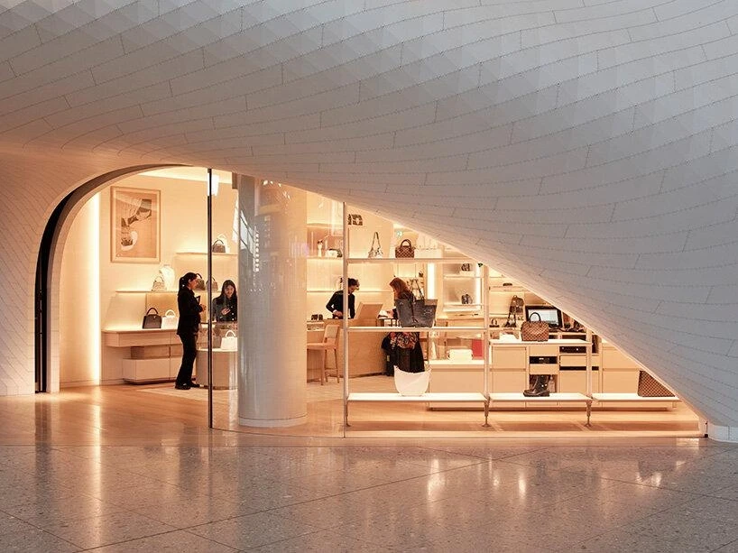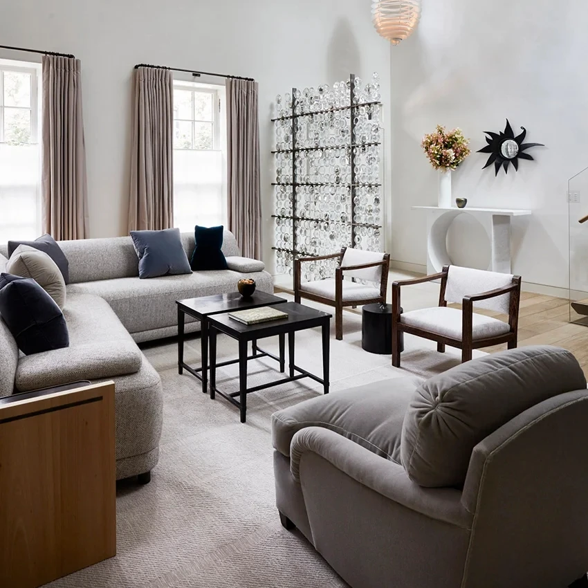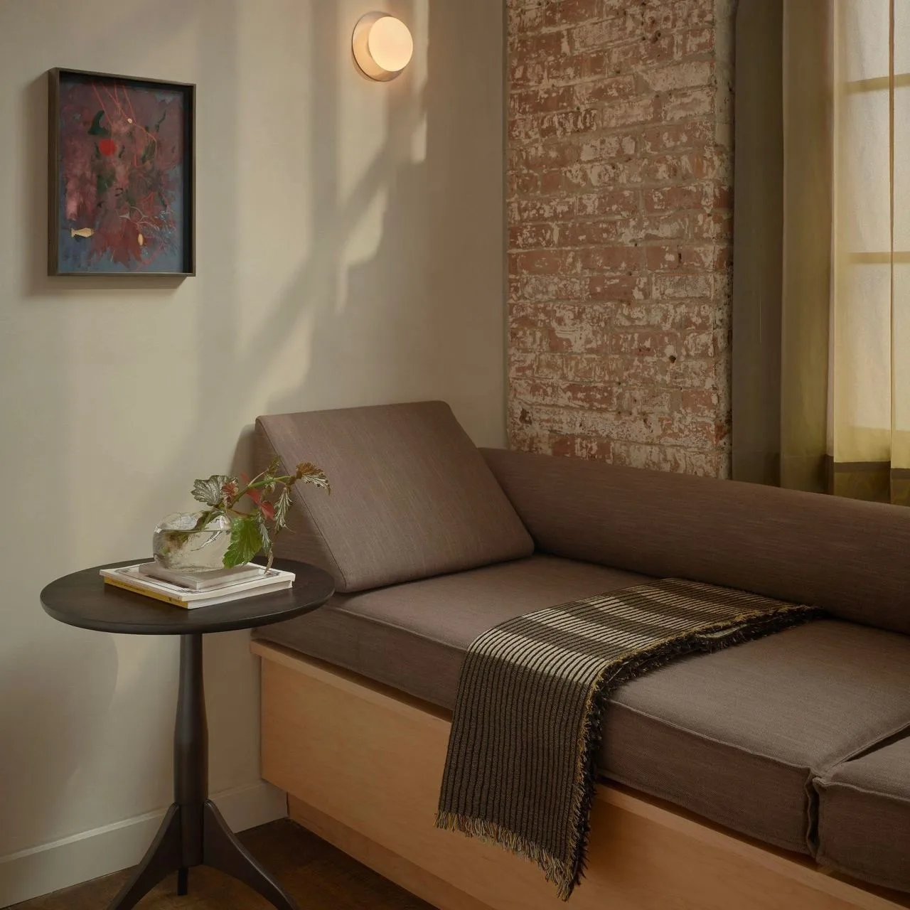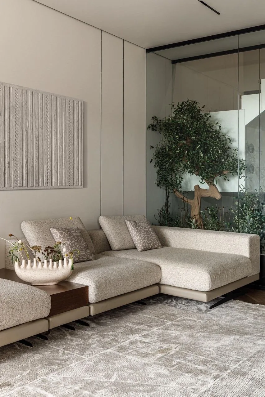 При входе посетителей встречает лаунж-зона с диваном на бетонном основании с бежевыми подушками и скульптурная лампа Akari E от Isamu Noguchi, создающая мягкий свет.