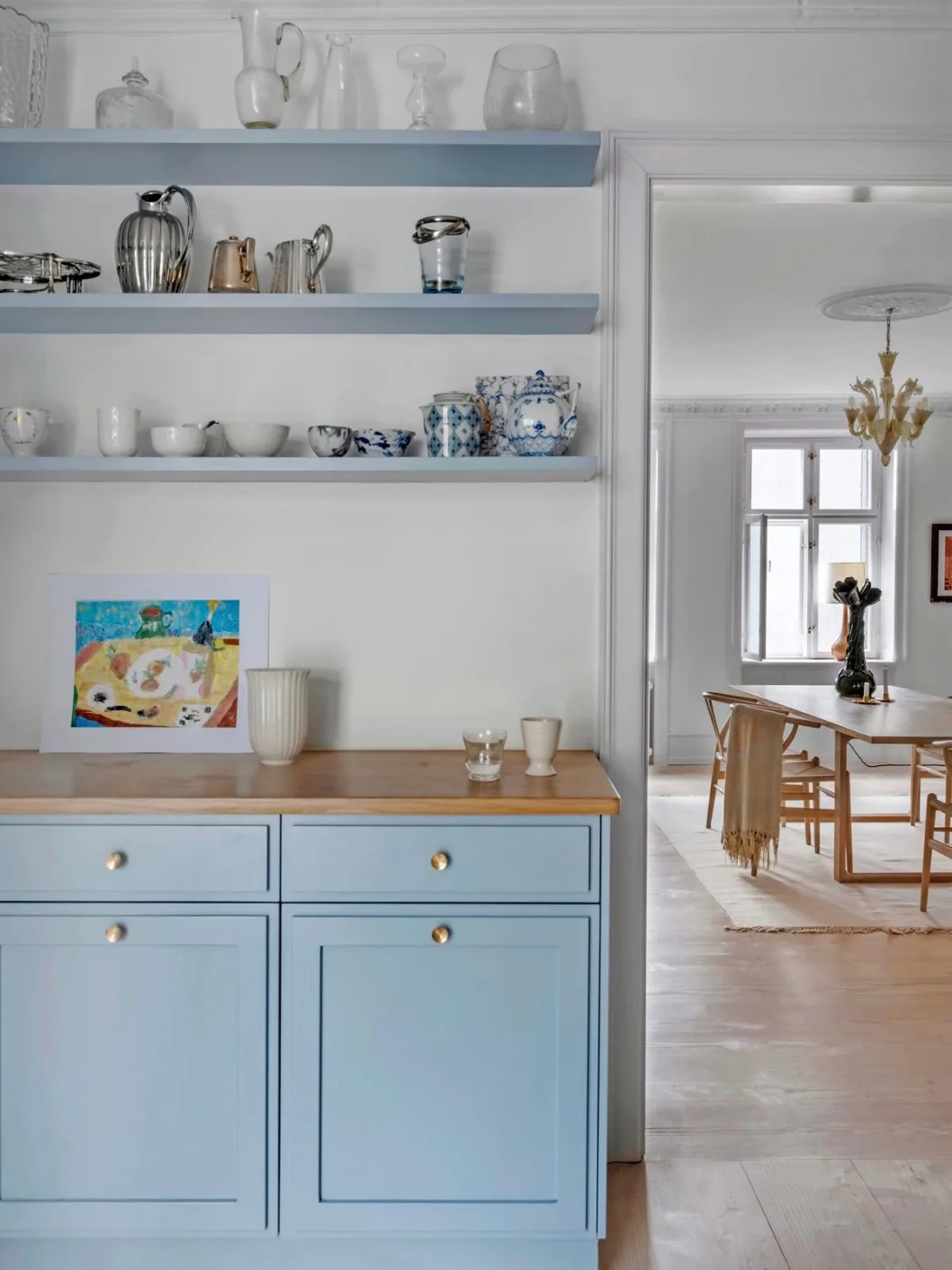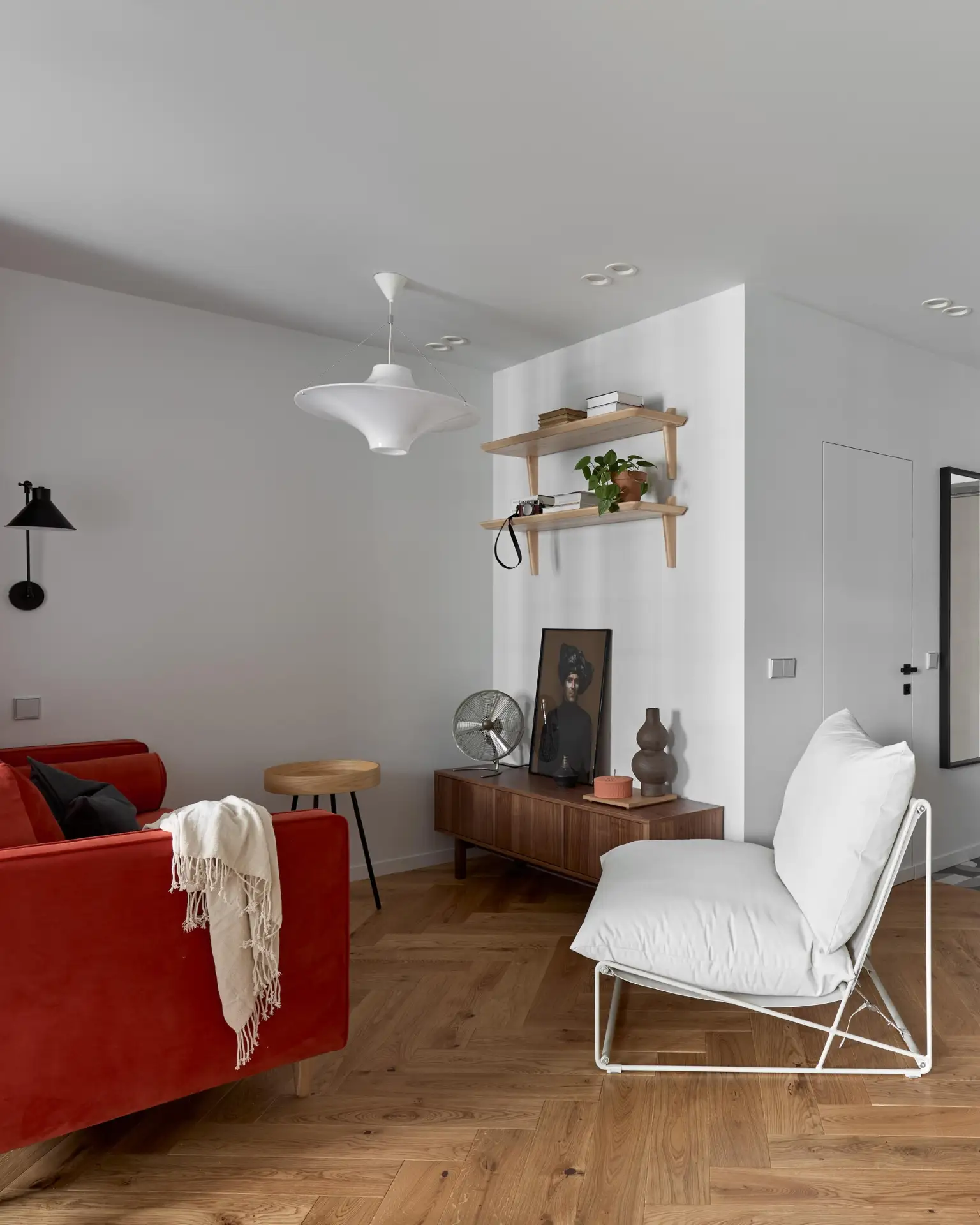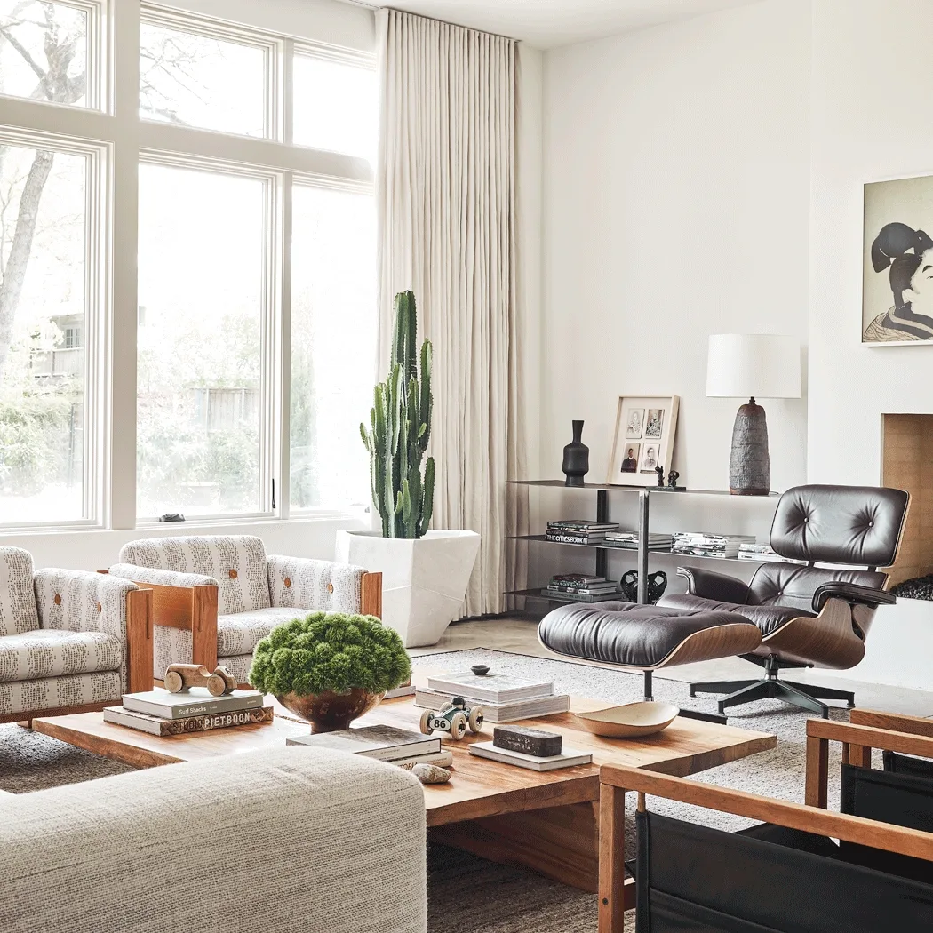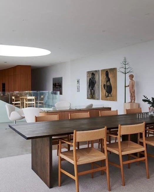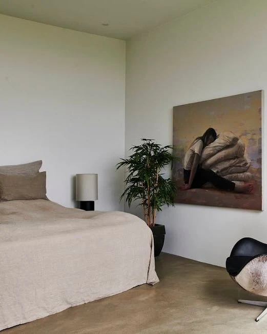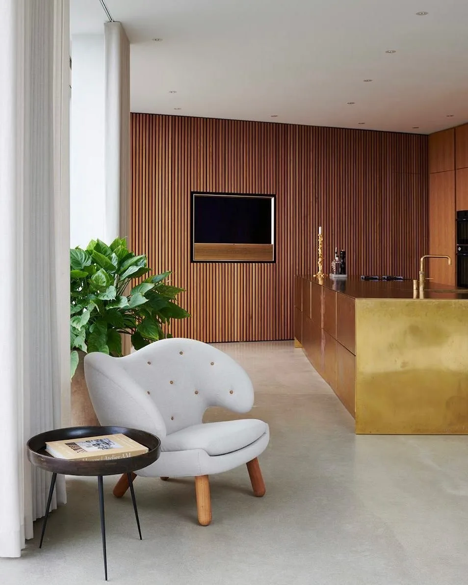 В доме много дизайнерских предметов. Например, кресло Pelican работы Финна Юля в гостиной — скульптурная форма с мягкими, почти крыльевидными подлокотниками. И кресло Egg Арне Якобсена в спальне — классика датского дизайна середины века, с закрытой, обволакивающей формой. Оба кресла — дань уважения мебельной традиции Дании.