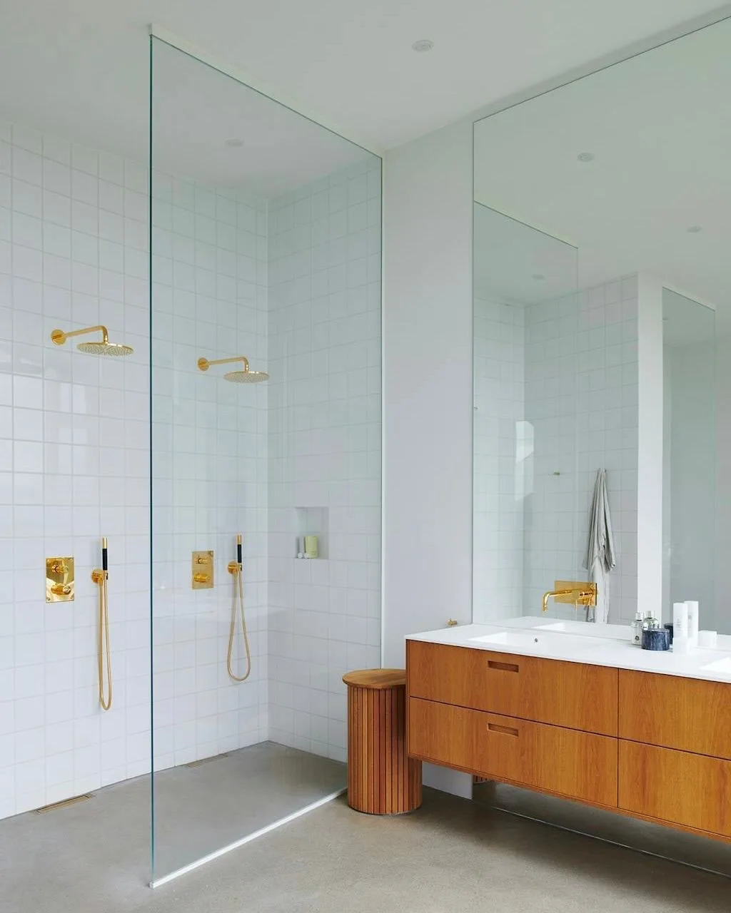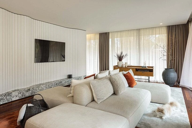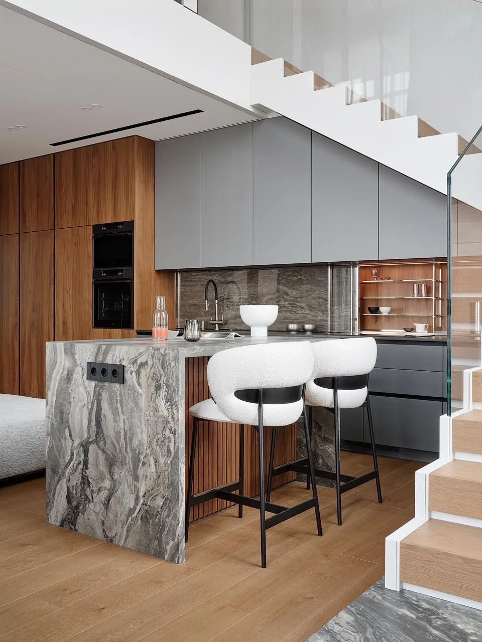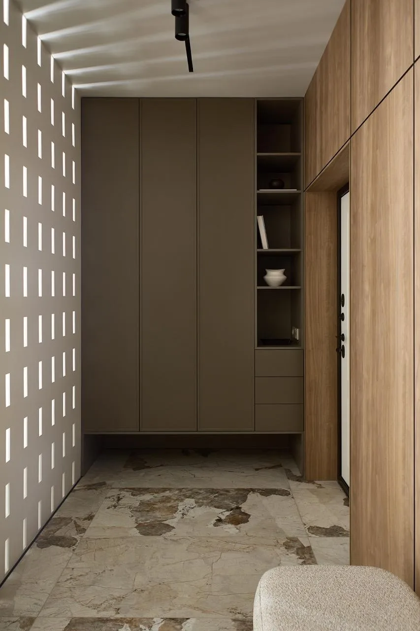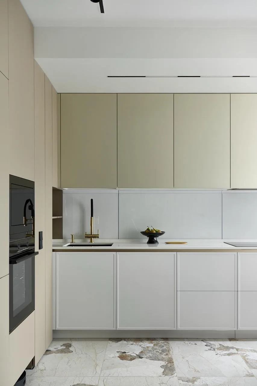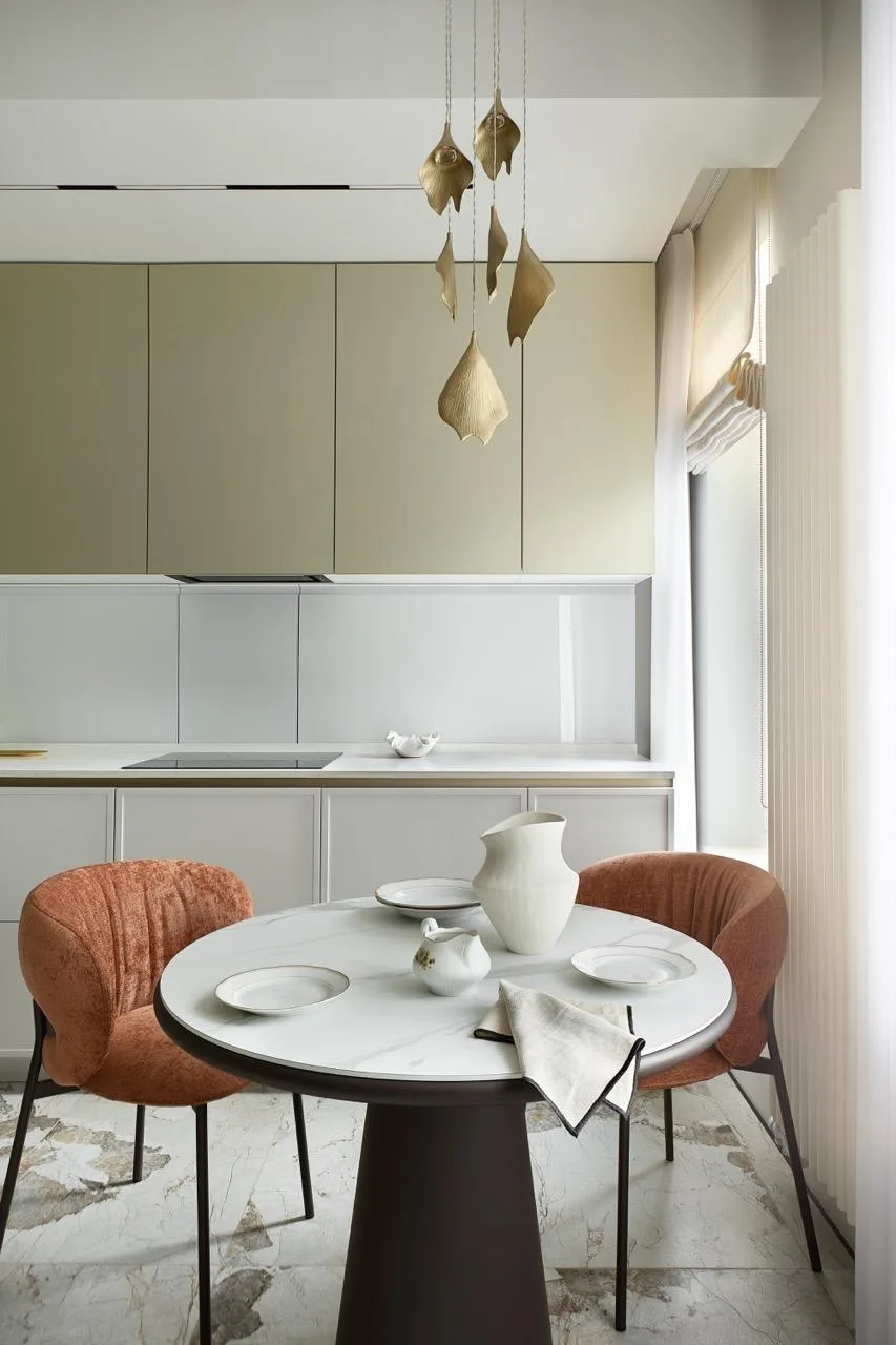 «Заказчики мечтали о легком пространстве для отдыха без визуального шума. Попросили учесть и то, что тут будут жить животные. Интерьер строится на сочетании разных текстур: гладкие и светлые каменные плоскости, теплое медовое дерево, латунные детали и тактильно приятный текстиль. Пространство объединяют плавные радиусные углы — от фасадов и тумб до столешниц и ниш. Они делают пространство мягким и безопасным», — говорит дизайнер.