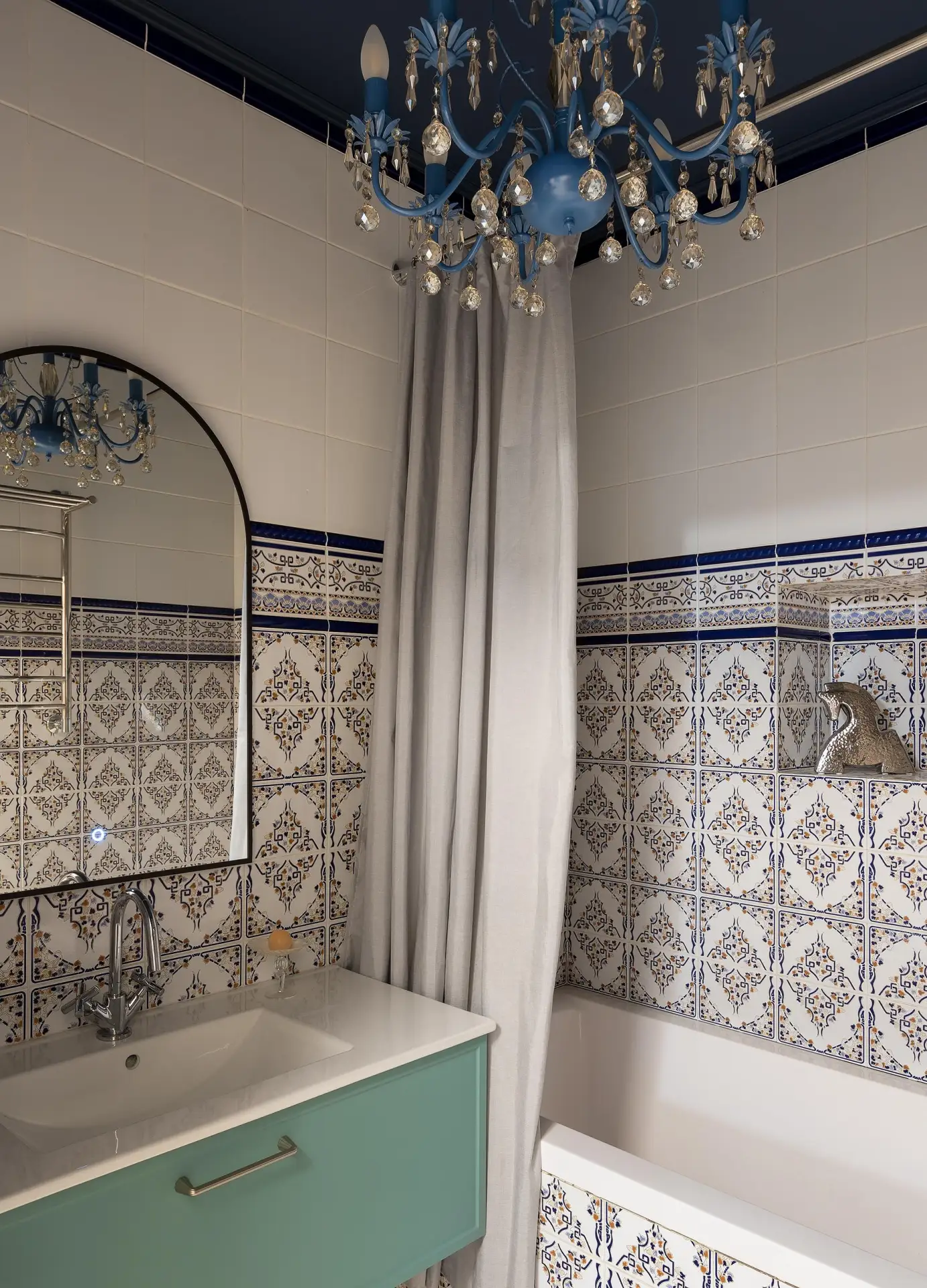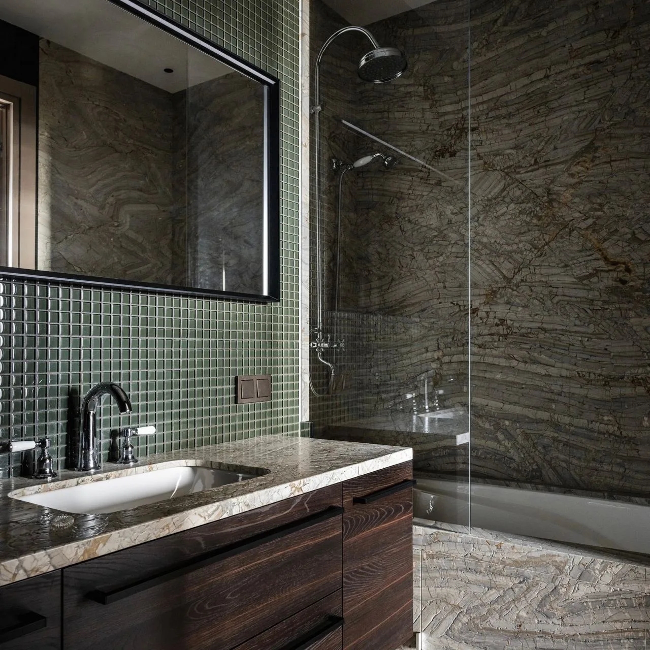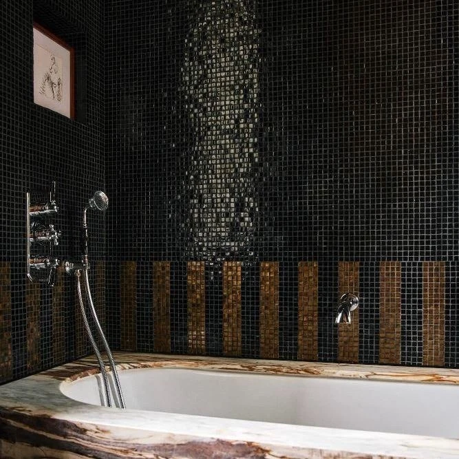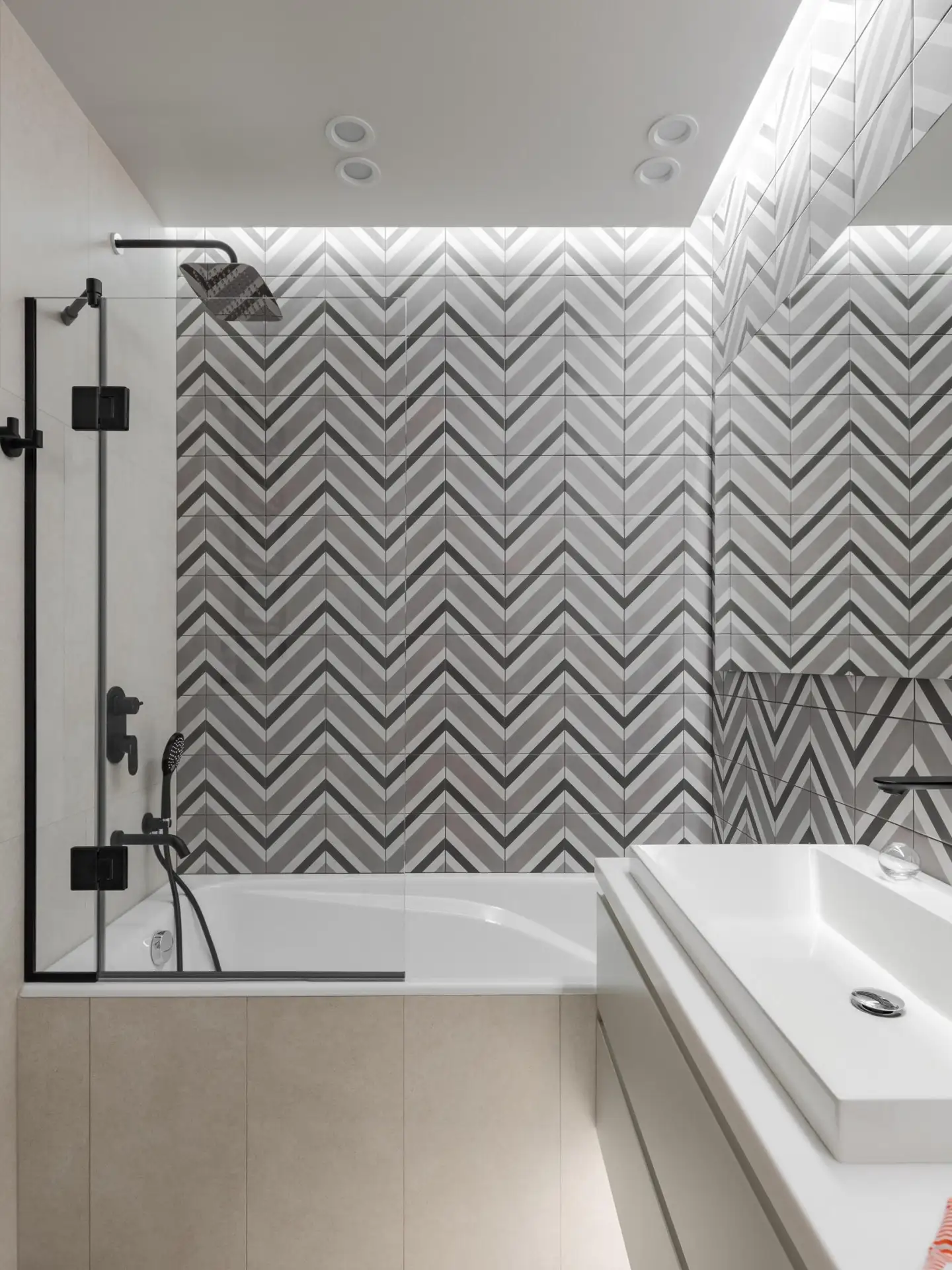 ✓ Выбрать крупные элементы, минимизирующие количество швов, или проявить творческий подход и сделать декор из мелкой мозаики? Сегодня допустимы оба варианта. Маленькую плитку можно размещать под разными углами: и вертикально, и горизонтально, и зигзагообразно (волны и шевроны сейчас особенно популярны)