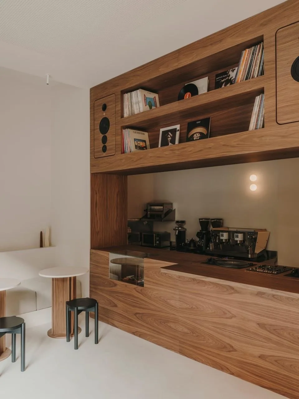 Бар — это пространственный и концептуальный центр помещения: массивная конструкция из орехового дерева, которая одновременно служит гигантским корпусом для колонок, изготовлена в мастерской Fusteria Vidal. В стойку интегрированы витрина для выпечки, полки для винила и кастомные колонки Bloom Island.