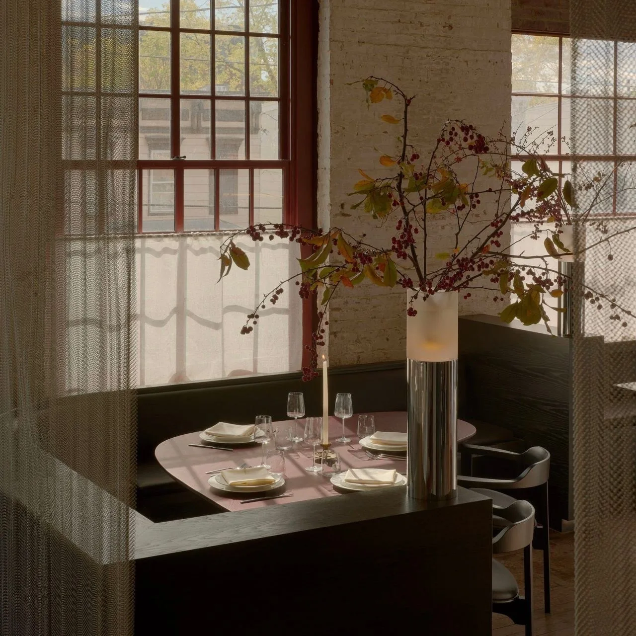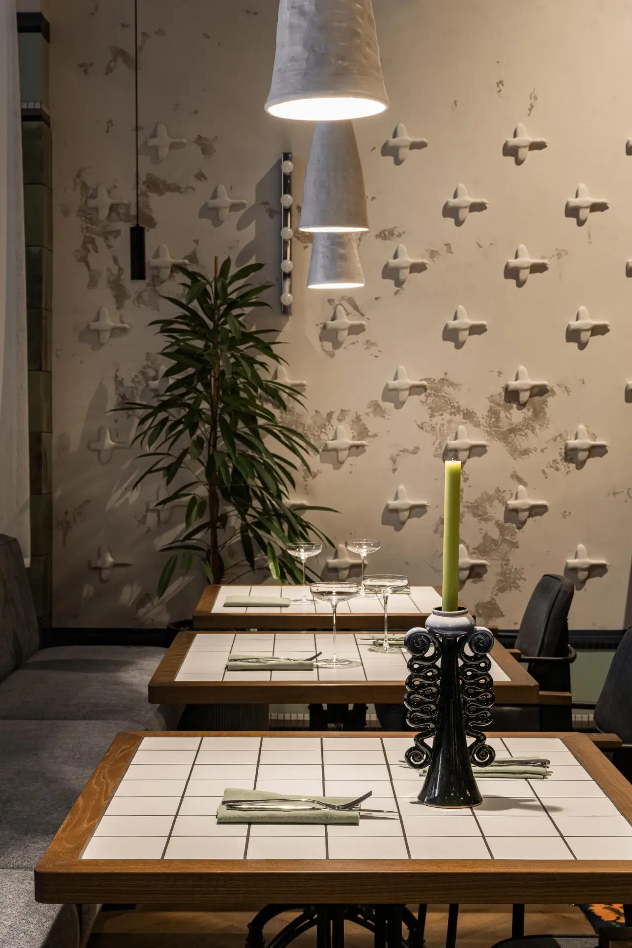 «Ресторан европейской кухни Nomades находится в здании бывшего завода „Уфимкабель“. У старого индустриального здания, конечно, есть свои плюсы: высокие потолки, огромные окна… Сложно было с конструкциями и с огромным количеством коммуникаций, которые мы переносили, укрепляли, зашивали. Очень много того, что казалось в этом плане невозможным, постепенно удалось реализовать», — рассказывает дизайнер.