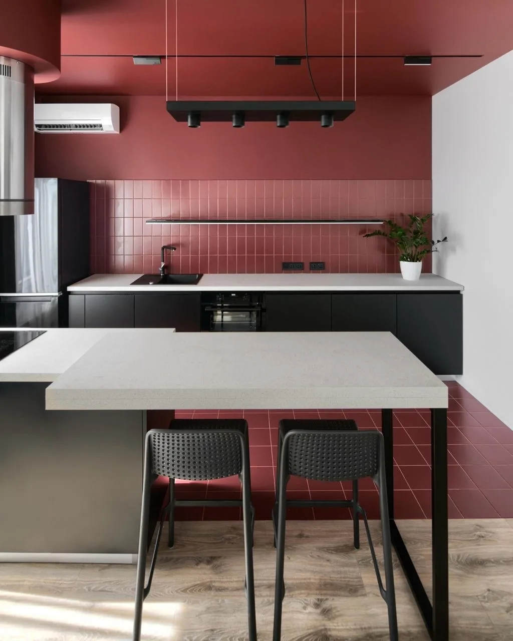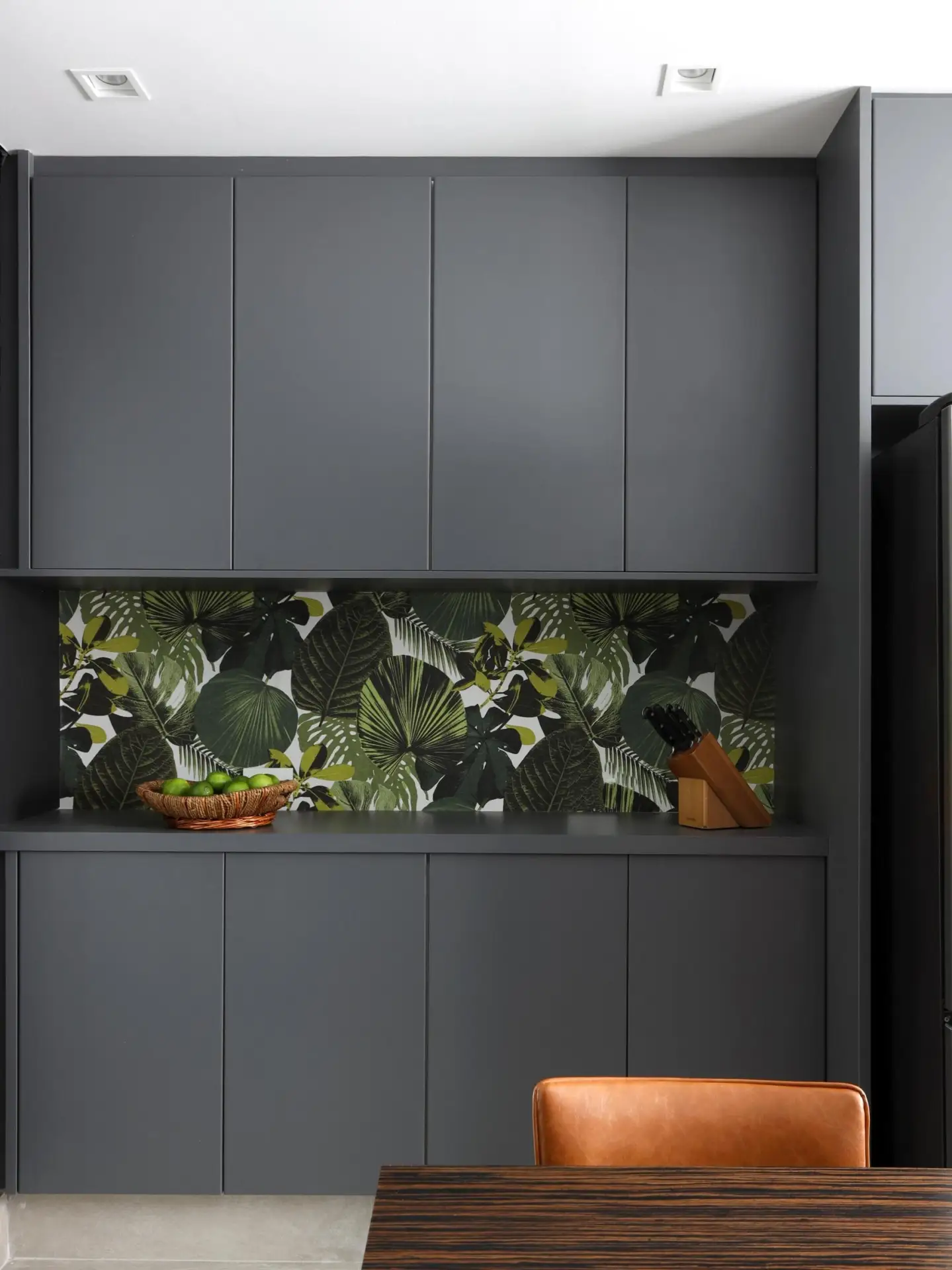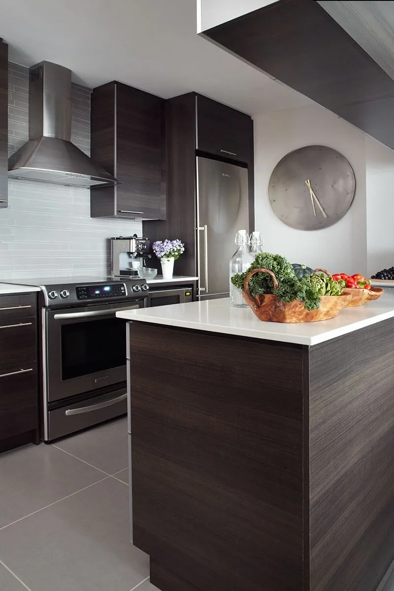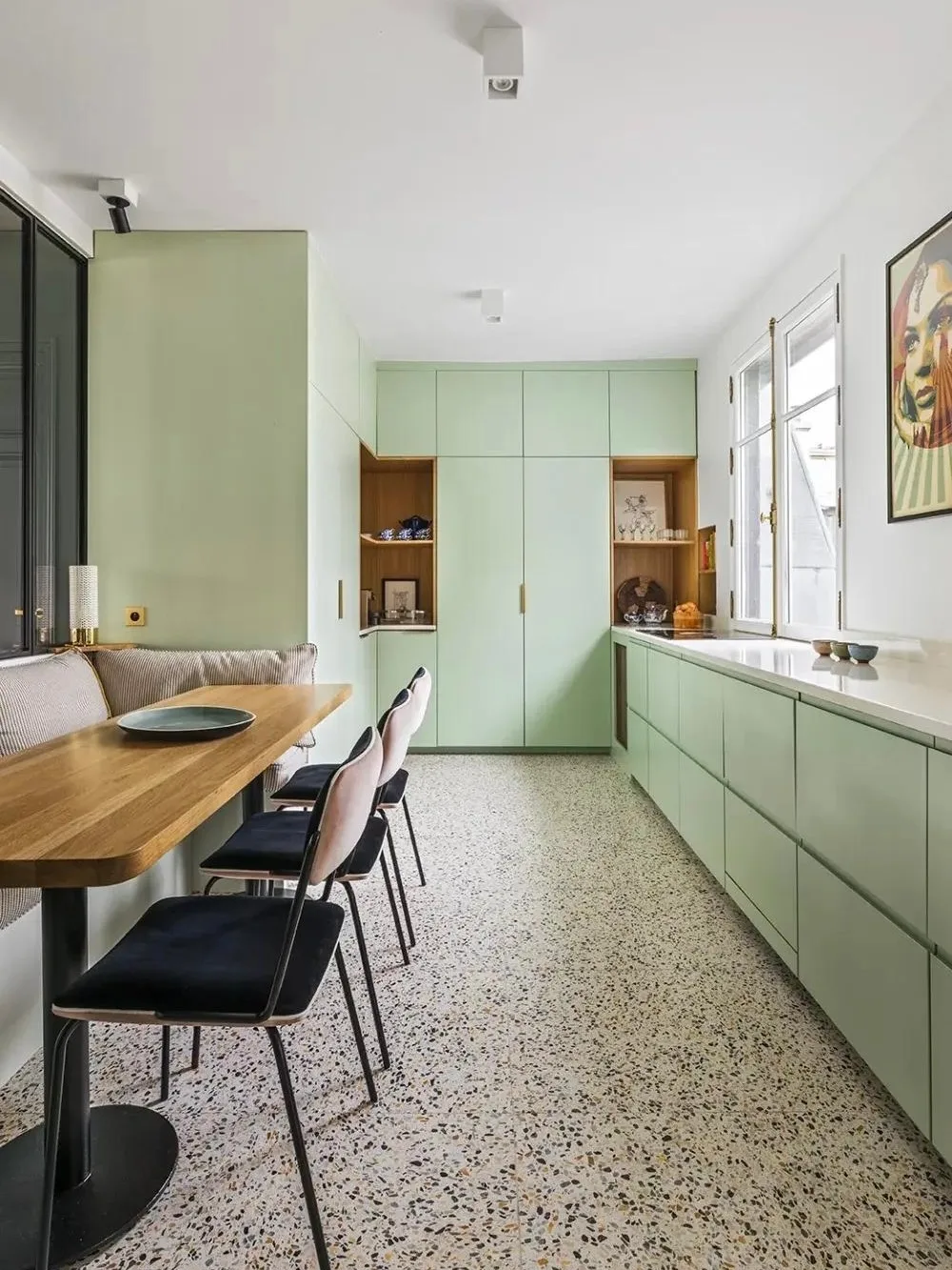 ✓ Чтобы кухня смотрелась свежей и актуальной, ее нельзя загромождать массивной мебелью. Эту ситуацию можно исправить аккуратно: например, избавиться от верхних шкафов.