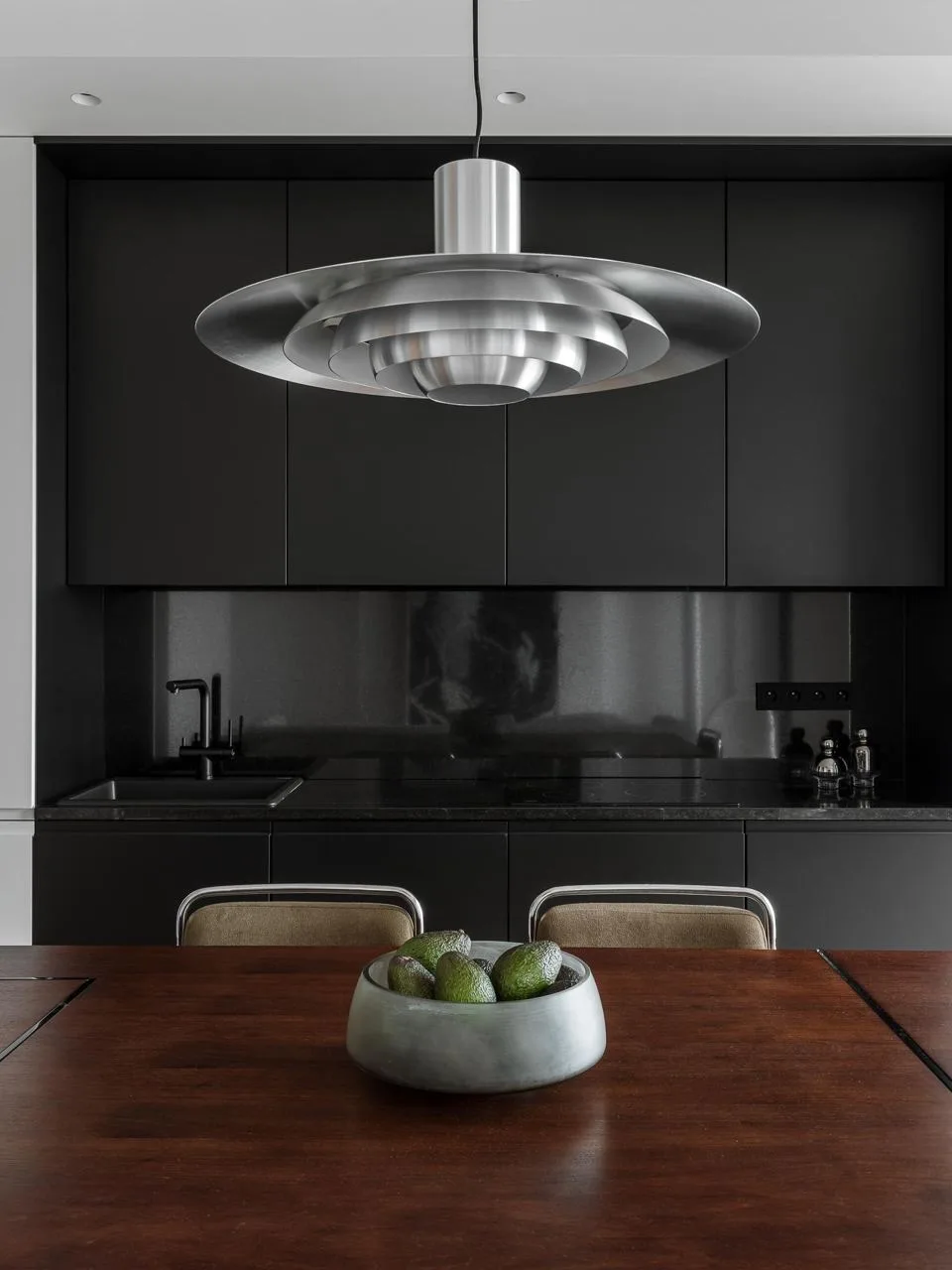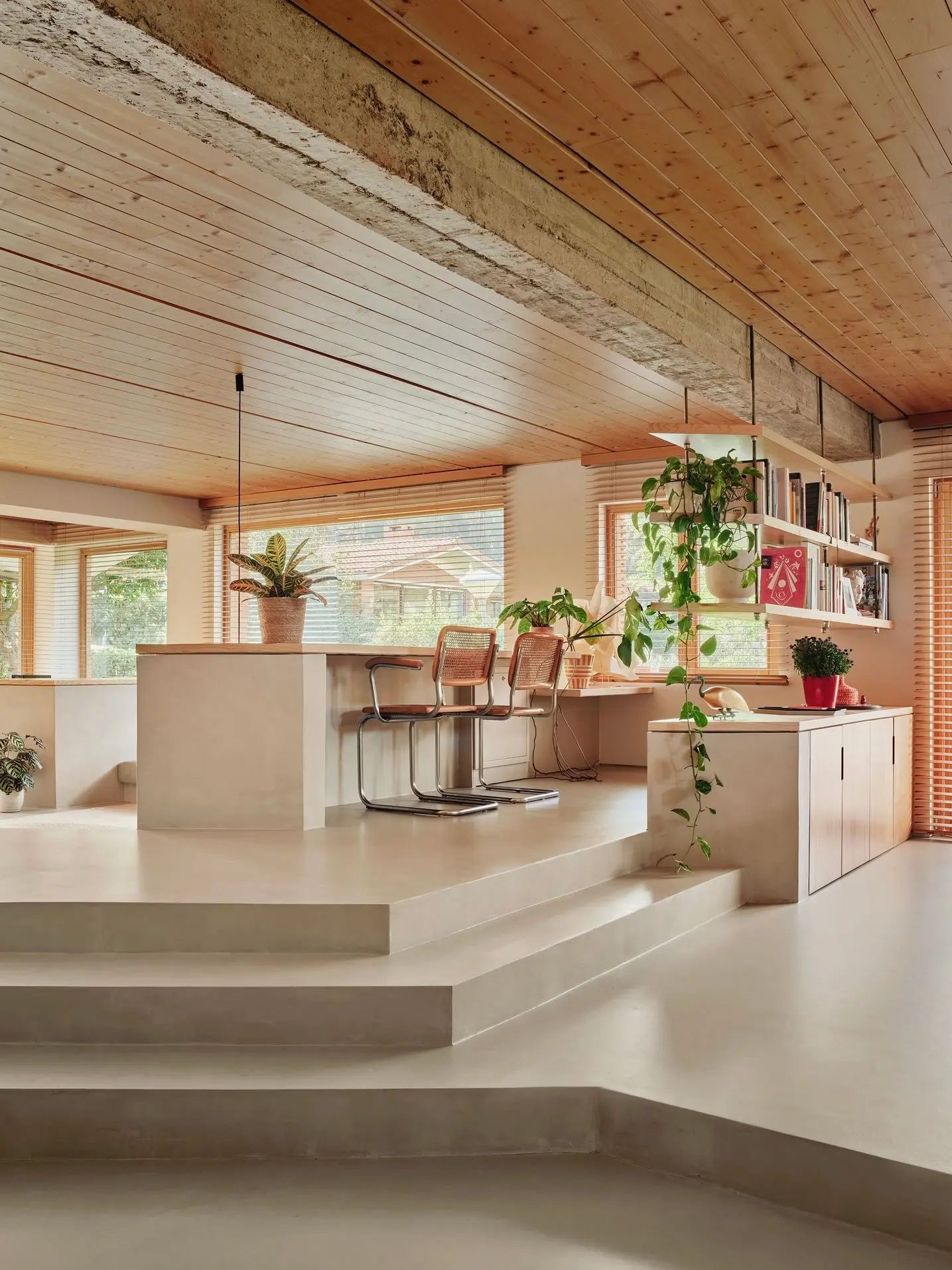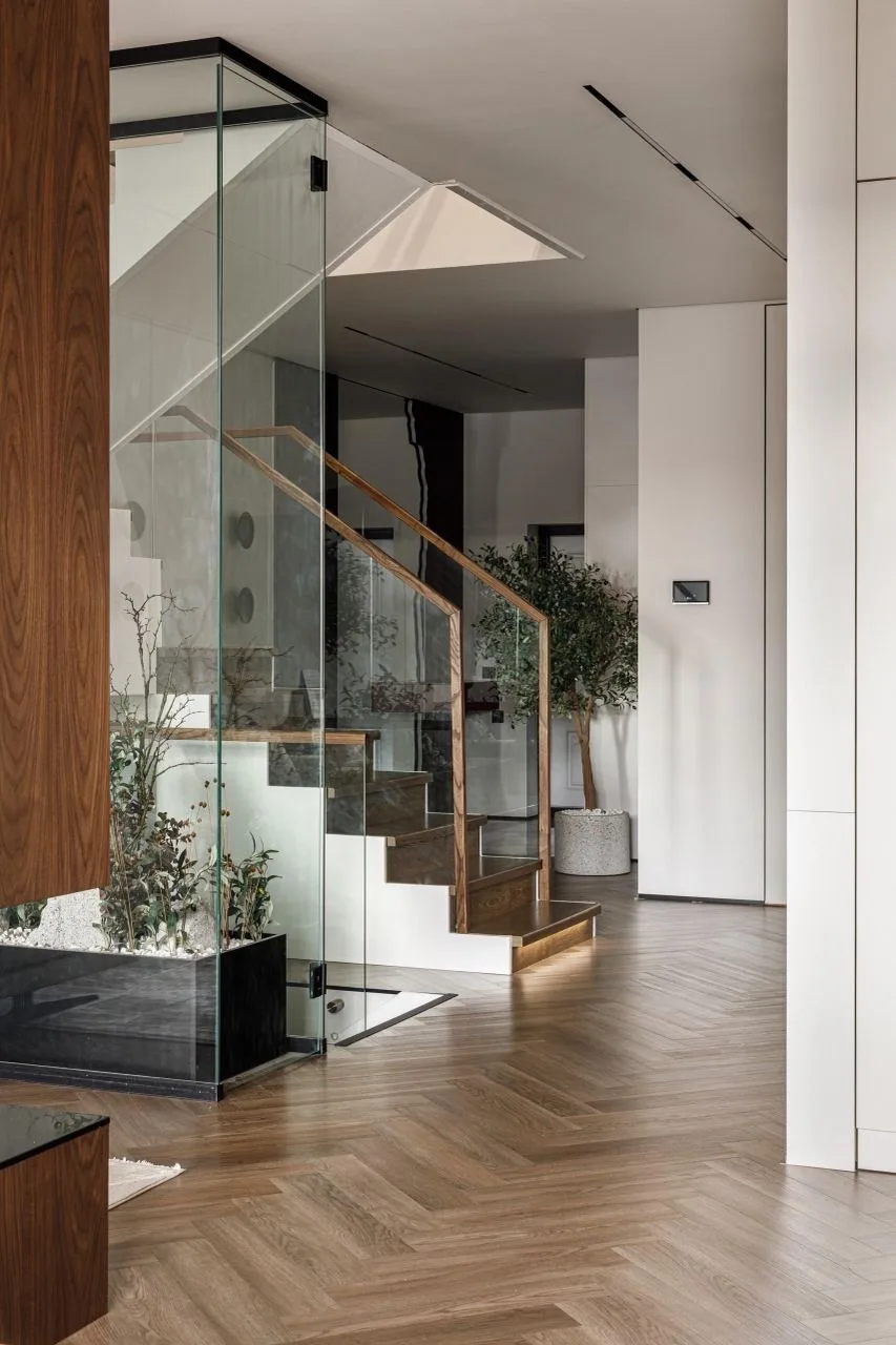 В новом проекте лестница стала центром всего. От нее расходятся уровни, она видна из любой точки гостиной. Перегородки убрали, и пространство наконец-то раскрылось. Кухня плавно переходит в столовую, столовая — в гостиную, гостиная — в кабинет. Дверей нет вообще. Только изменения уровня пола обозначают разные зоны.