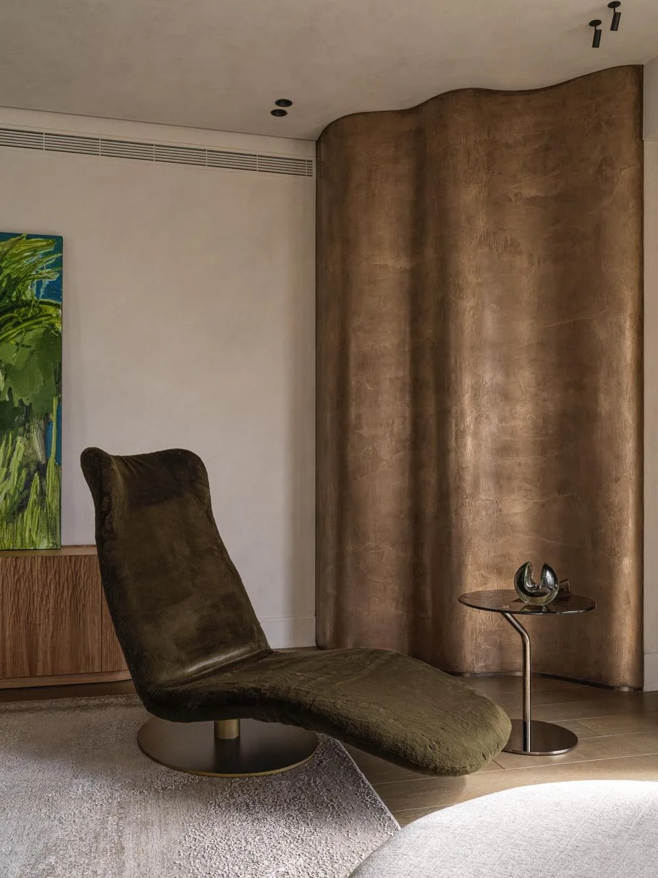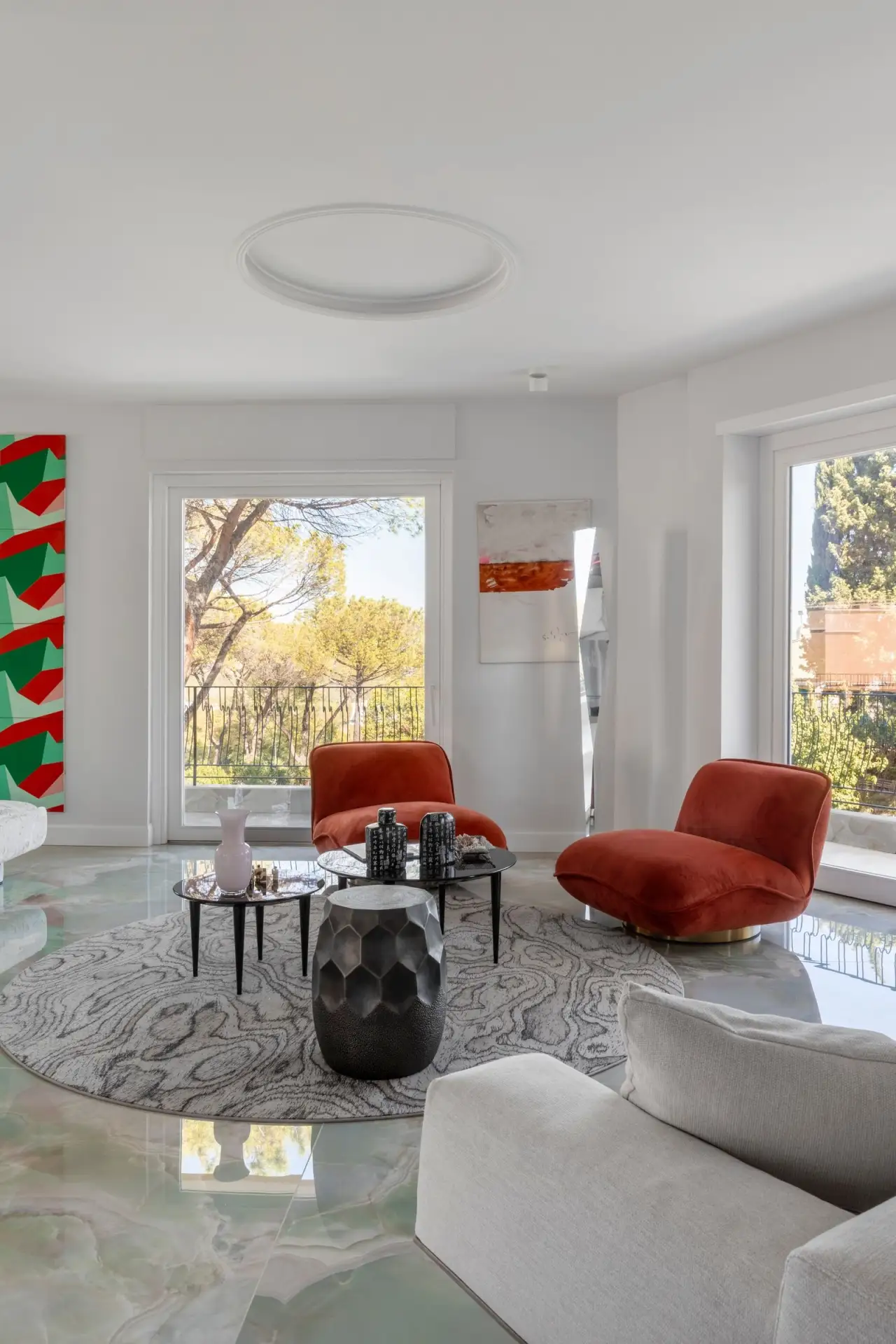 Из окон этой квартиры в здании 1960-х годов видна долина Тибра — мягкие холмы, изгибы реки, бесконечный горизонт. Дизайнер Джорджия Деннерлейн из студии Loto AD Project сделала этот пейзаж отправной точкой проекта.