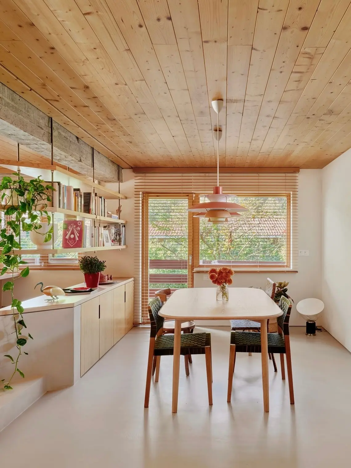В доме есть гостиная, столовая, кухня, несколько спален и небольшой рабочий кабинет с маленьким внутренним двориком, куда тоже проникает свет.