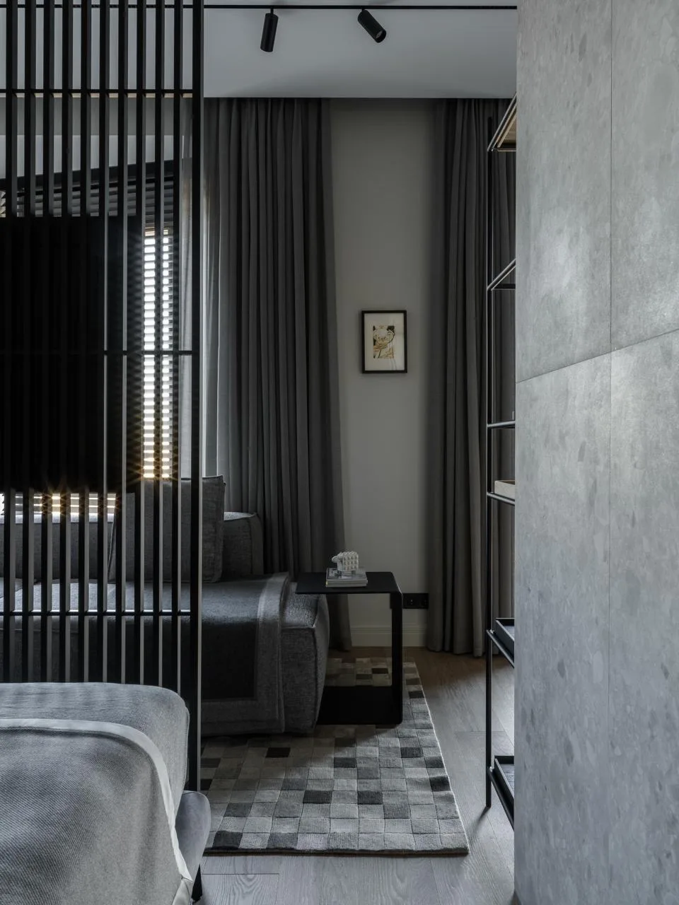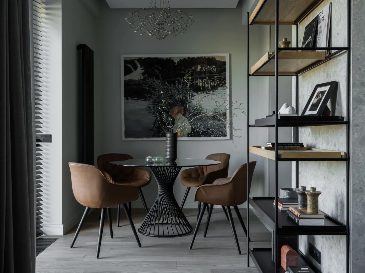 «Заказчик — мужчина, имеющий собственный бизнес. Он полностью доверился нашему видению. Квартира расположена на последнем этаже, так что с потолками повезло — около 6 метров. Их мы подчеркнули изящным струнным освещением. Прекрасны здесь и большие окна с римскими шторами, они впускают много света и позволяют любоваться видами города», — рассказывает команда Shishkov studio.