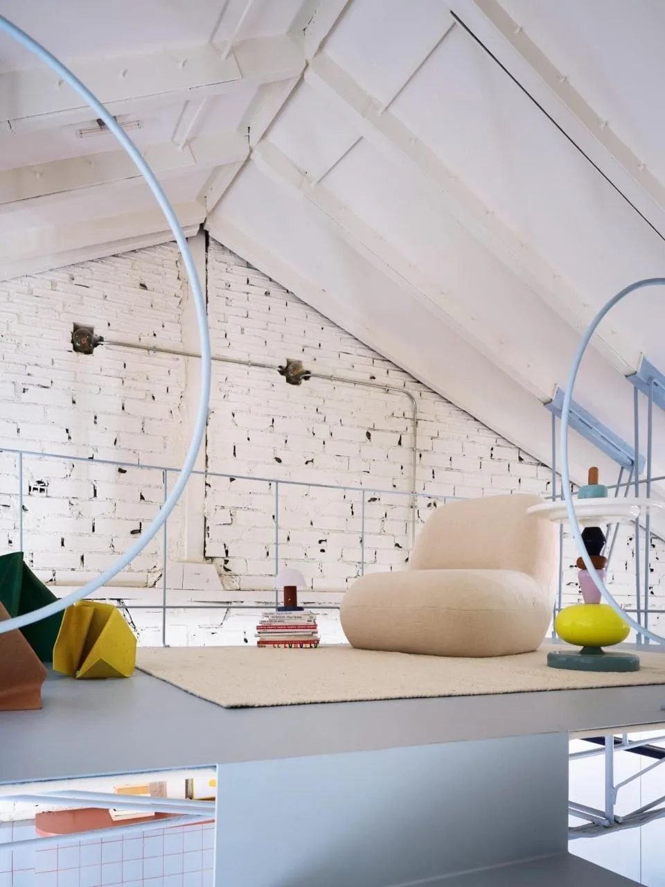 Главный элемент квартиры — парящий куб. Он заменил старый мезонин и парит над гостиной. Куб сделали из стекла и покрасили в розовый цвет. Внутри — спальное место на двоих. Куб висит на металлических балках, а ведет к нему легкая металлическая лестница. Дизайнер выбрала розовый не случайно: она хотела уйти от привычной морской гаммы и добавить яркий акцент.