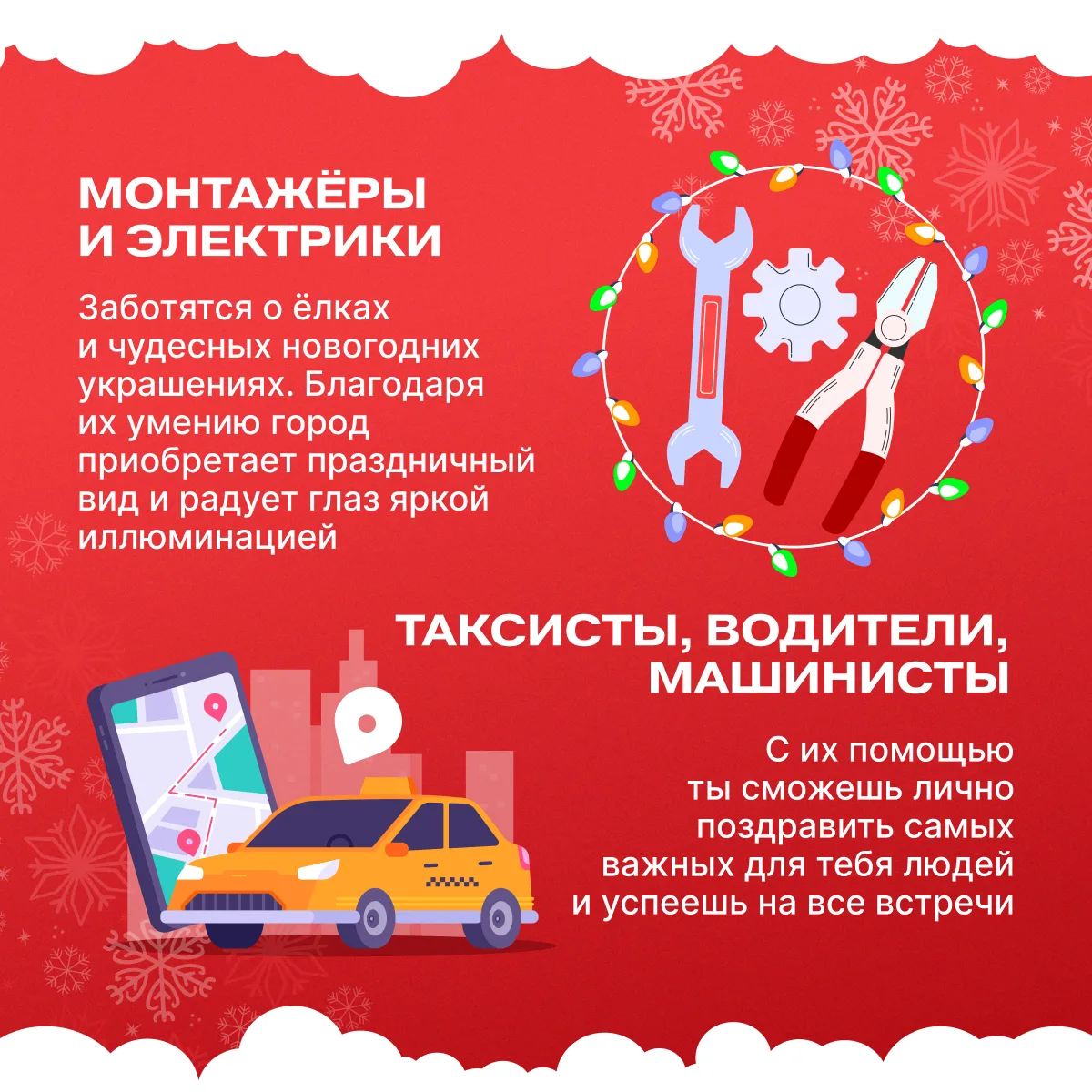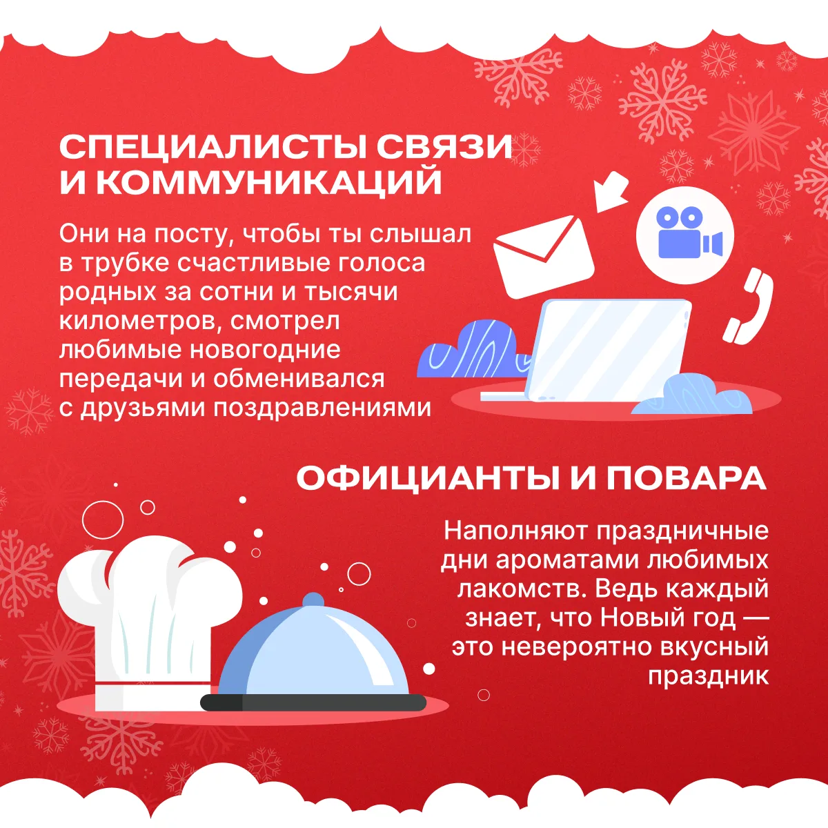 Для самоотверженных героев — врачей, полицейских, пожарных — трудовые будни продолжаются даже в канун главного зимнего праздника. Но есть ещё много представителей важных для общества профессий, чья работа создаёт ту тёплую атмосферу, за которую все любят Новый год.