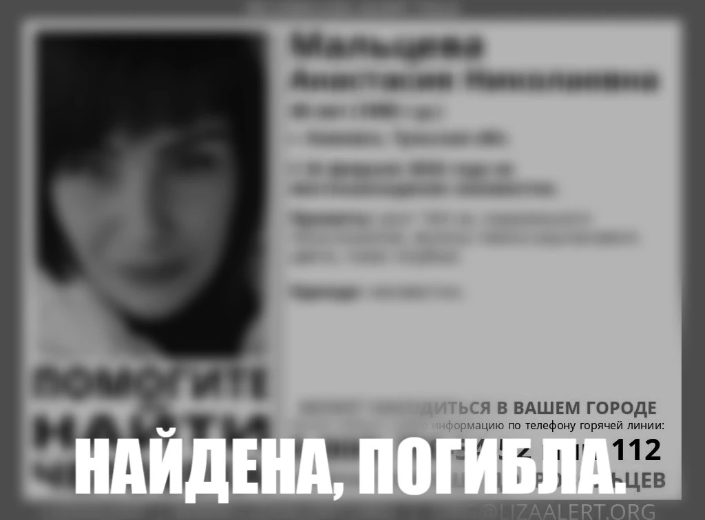 Представители отряда «ЛизаАлерт» прекратили поиски 30-летней Анастасии Мальцевой из Кимовска, о судьбе которой ничего не было известно с 24 февраля.