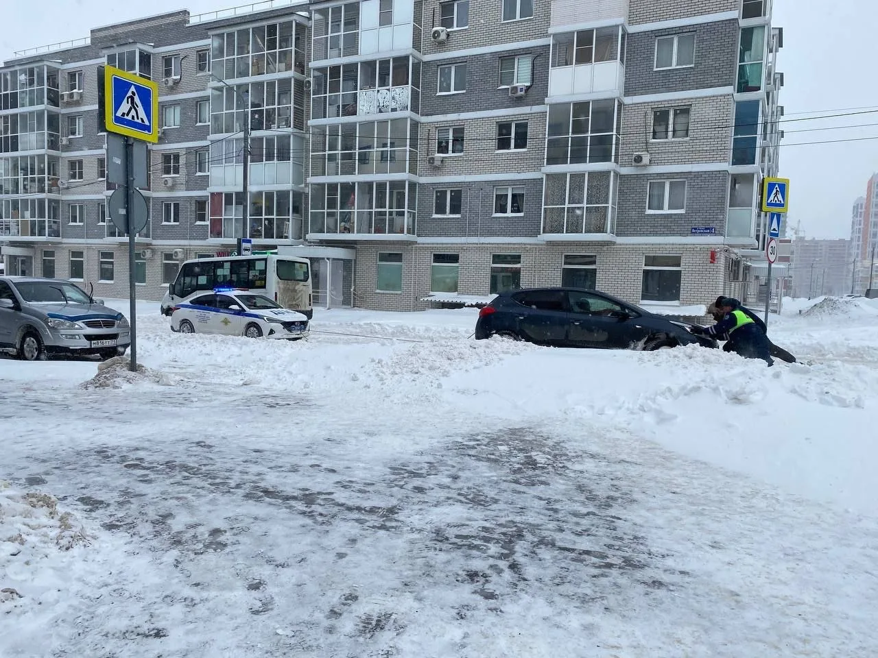 Сотрудники ДПС помогают выбраться из большого сугроба в Петровском