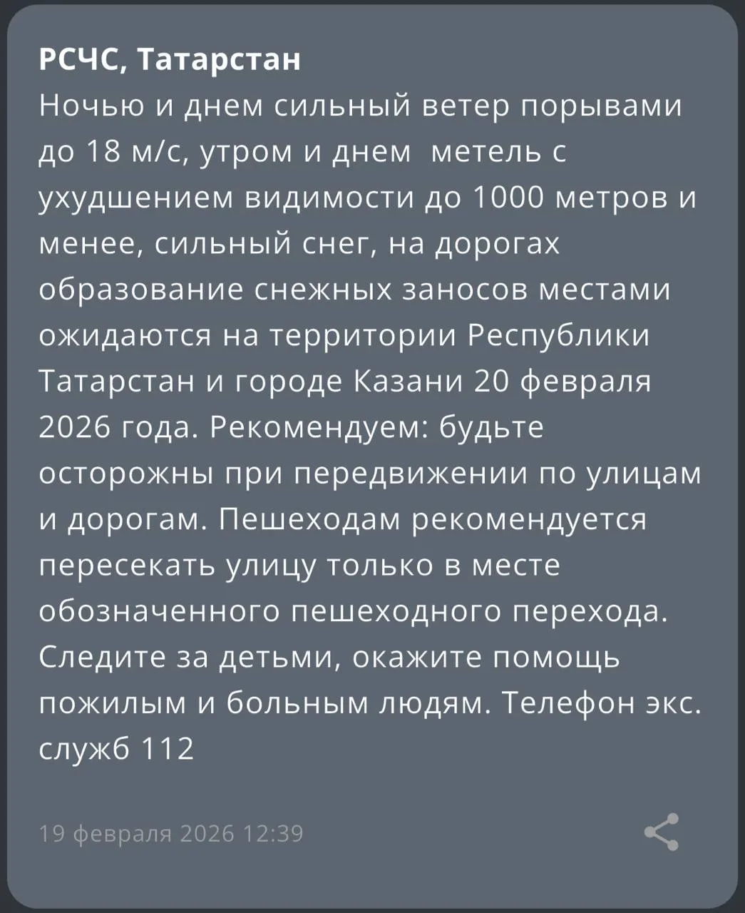 ⚡️Метель с ухудшением видимости и сильный снегопад, а также штормовой ветер накроют завтра Казань — МЧС.