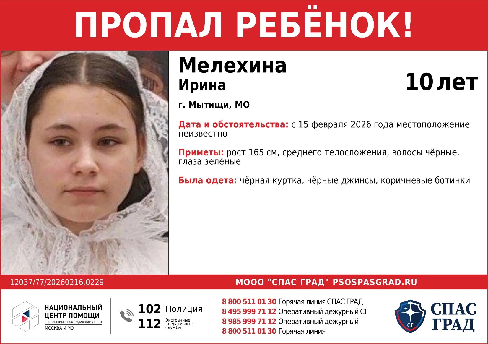 • 15 февраля 2026 года в Мытищах девочка ушла и до настоящего времени не вернулась.