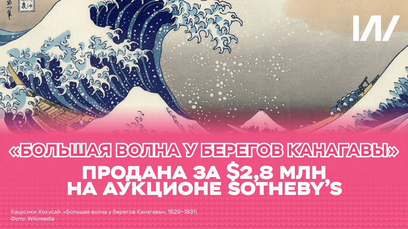 Один из ранних оттисков знаменитой гравюры Кацусики Хокусая «Большая волна у берегов Канагавы» был продан на аукционе Sotheby’s в Гонконге 22 ноября. Работа ушла с молотка за $2,8 млн, что значительно превысило предпродажную оценку в $0,6–1 млн.