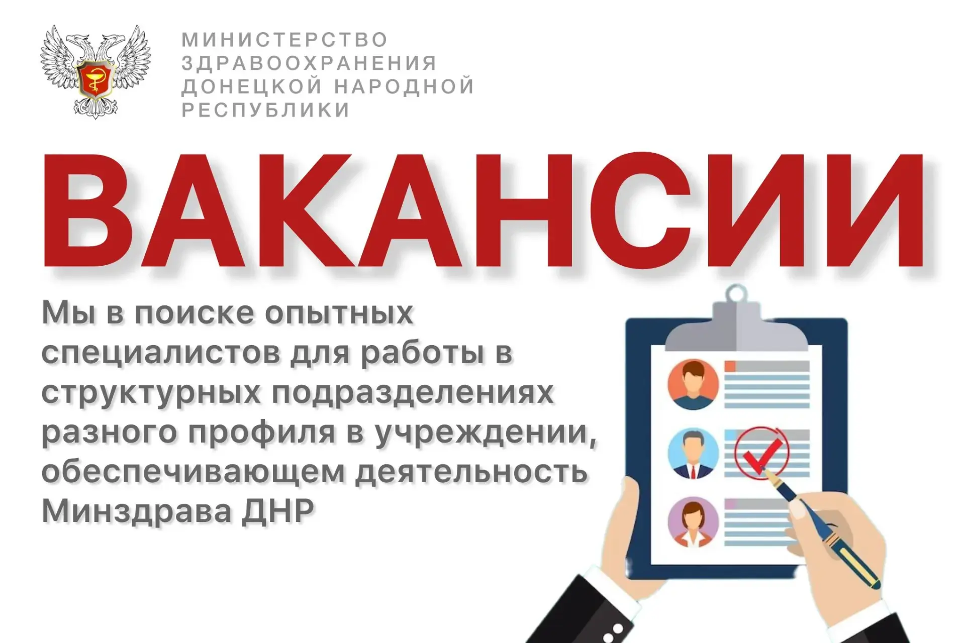 В связи с расширением штата учреждения, обеспечивающего деятельность Минздрава ДНР, открыты вакансии в следующие структурные подразделения (в том числе на руководящие должности):