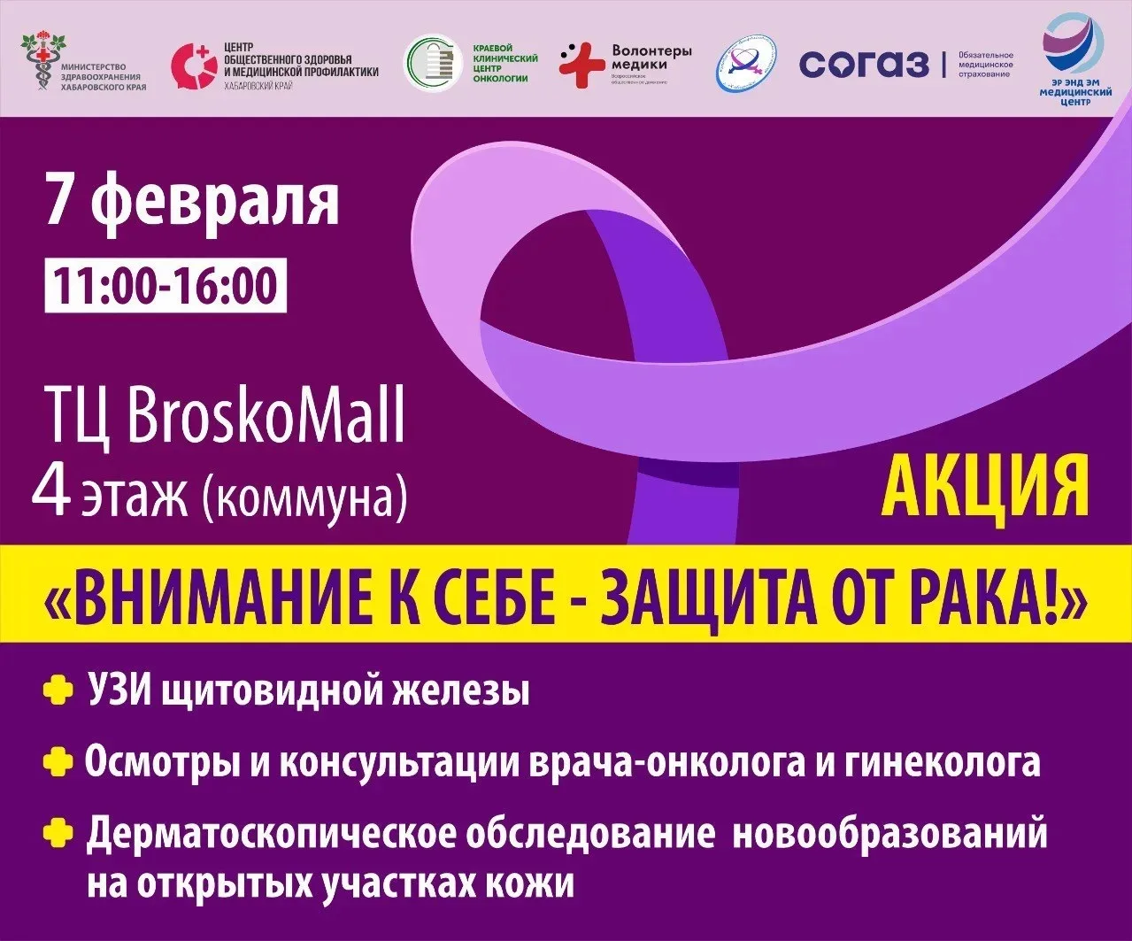 Мероприятие посвящено профилактике онкологических заболеваний и повышению осведомленности жителей края о важности ранней диагностики и своевременного обращения за медицинской помощью. В честь Всемирного дня борьбы против рака хабаровчан ждет насыщенная программа в ТЦ Brosko Mall:
