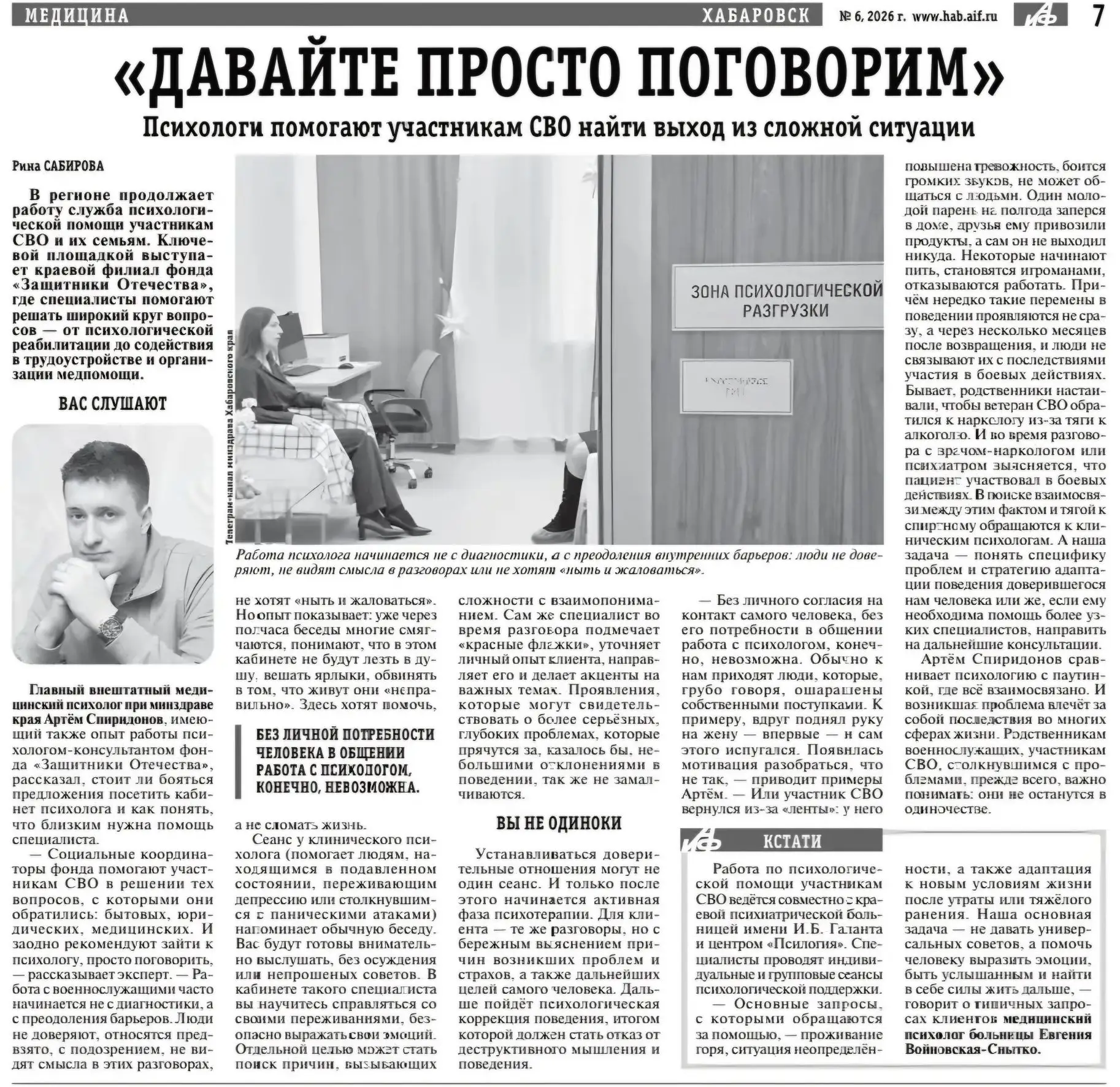 В Хабаровском крае участников СВО и членов их семей поддерживают комплексно: льготы и выплаты, профессиональная переподготовка, помощь с жильём и многое другое, включая психологическую поддержку. Её специалисты оказывают в фонде «Защитники Отечества», где проводят индивидуальные и групповые сеансы, помогают справиться со стрессом и тревогой.