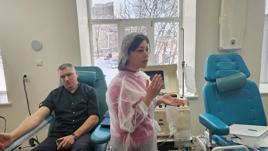 Заведующий отделом заготовки донорской крови и её компонентов Евгений Рожков продемонстрировал, как работает автоматизированная система переработки крови. Сегодня благодаря ей процесс стал высокотехнологичным: кровь разделяют на компоненты с ювелирной точностью, а затем проводят обезвреживание вирусов и бактерий.