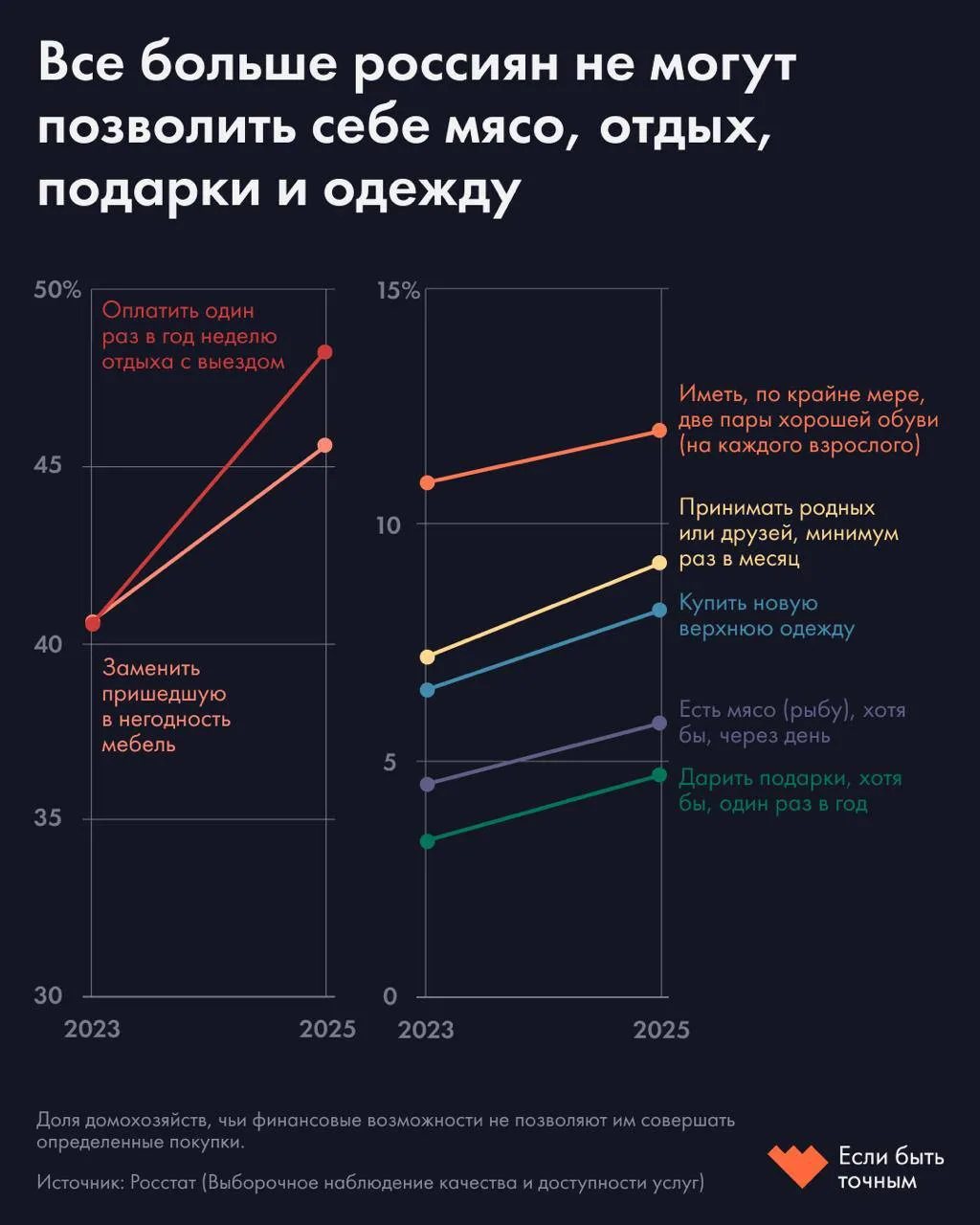 По данным выборочного наблюдения Росстата (48 тысяч домохозяйств по всей стране), за два года заметно выросла доля семей, которым не хватает на базовые вещи. Поехать в отпуск хотя бы раз в год не могут 48,3% — в 2023-м таких было 40,5%. Заменить сломанную мебель не в состоянии 45,6% семей против 40,6% двумя годами ранее. Хорошим своё питание назвали 63,6% — против 70,7% в 2023-м.