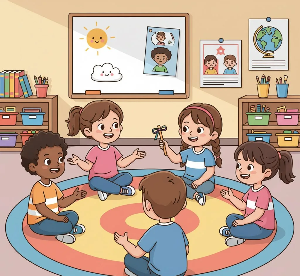 * Что делать: В начале занятия предложить детям вместе создать "Правила нашего класса/группы", чтобы всем было комфортно. Каждый предлагает свои правила ("не перебивать", "говорить по очереди", "слушать друг друга"). Затем дети вместе голосуют и принимают общие правила.