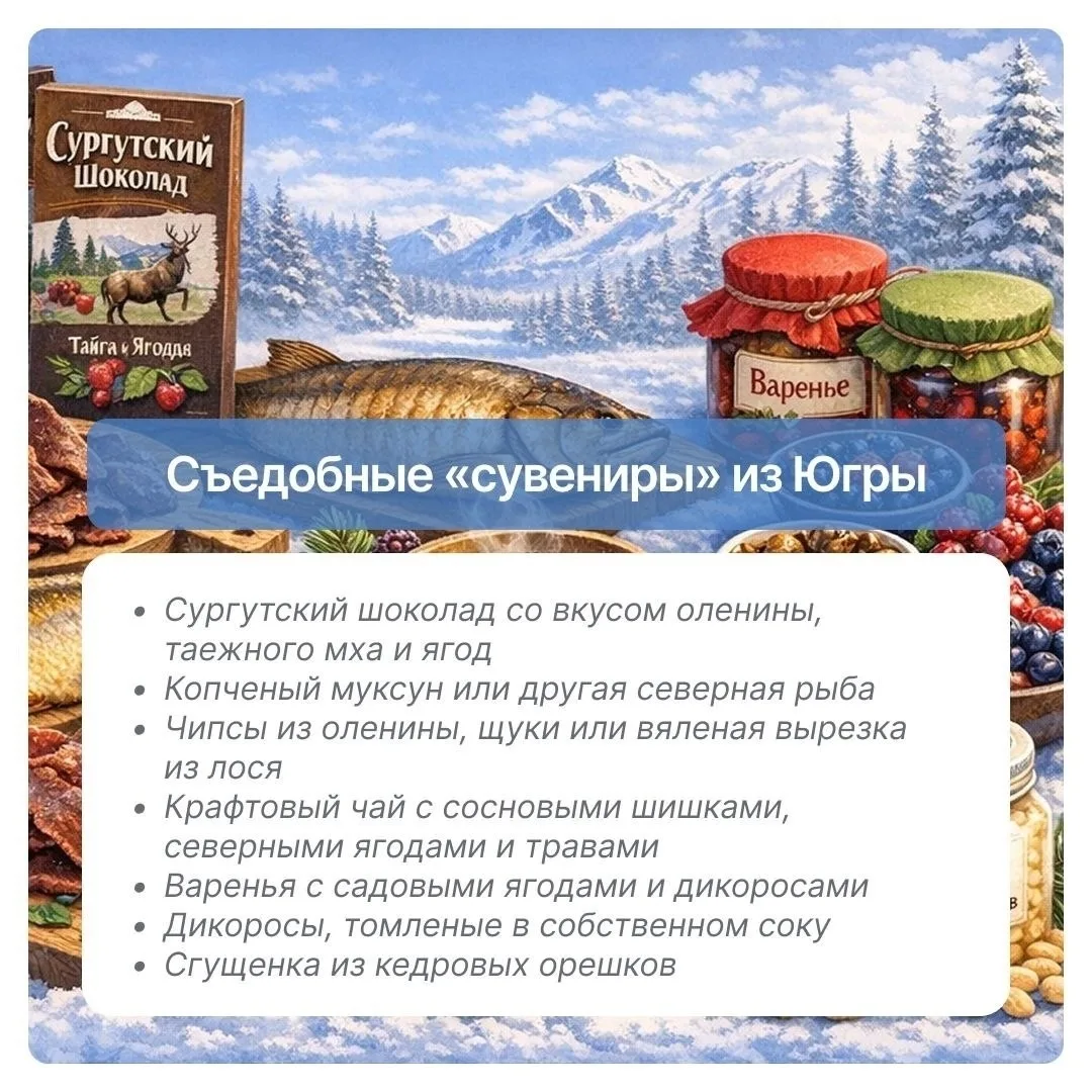 Например, отличным подарком станет муксун — северная рыба с нежным вкусом, которая ценится за свои полезные свойства и является настоящим символом севера. Также можно выбрать изделия из бересты, традиционные украшения или теплые аксессуары из натуральной шерсти, которые согреют в холодные зимние вечера.