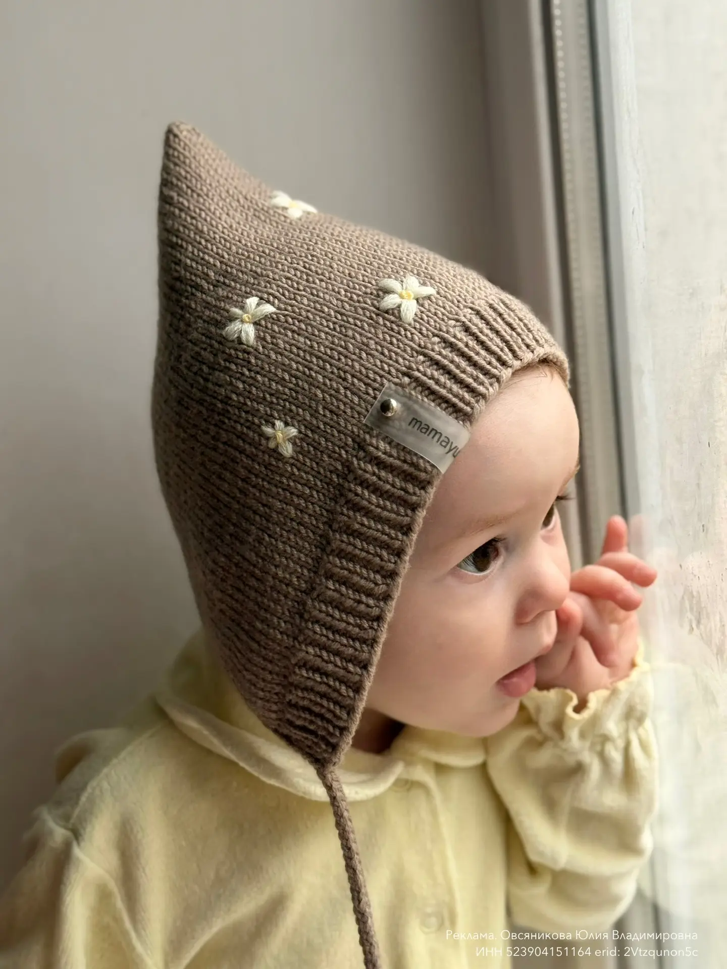 〰️ бежевая шапочка с цветочками, связанная из пряжи итальянский меринос