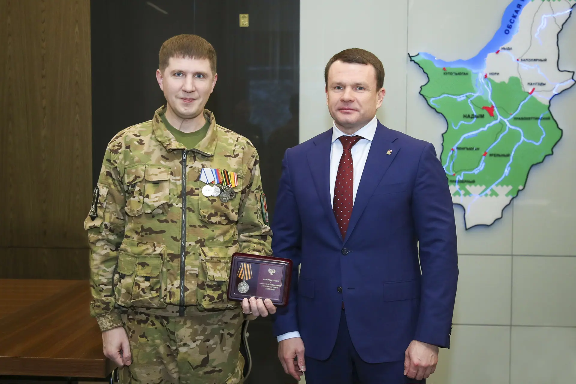 В преддверии Дня защитника Отечества вручил ветерану боевых действий, участнику региональной программы «Герои Ямала» Михаилу Золотому медаль «За храбрость» IV степени Донецкой народной республики.