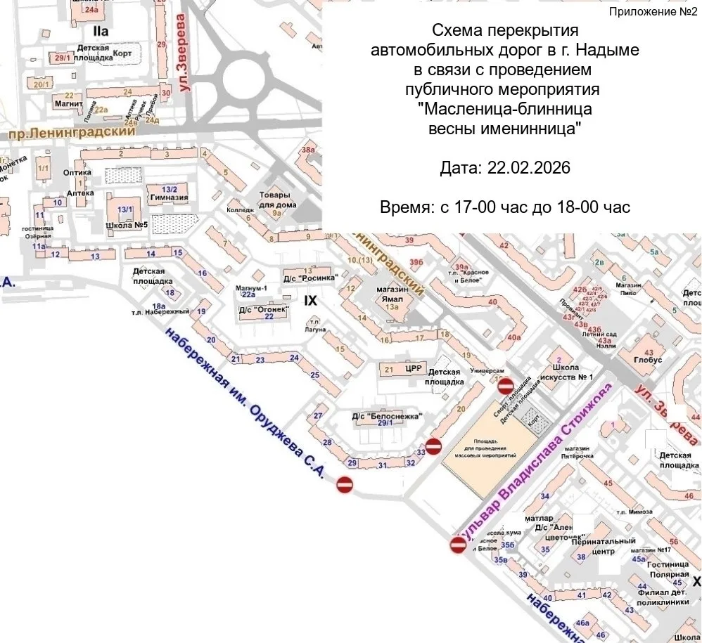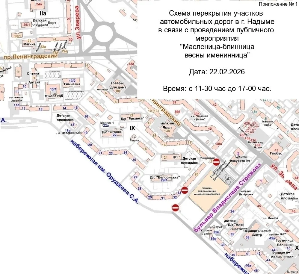 На время проведения 22 февраля мероприятий, посвященных празднованию масленицы, в Надыме будет ограничено движение транспорта на нескольких участках дорог: