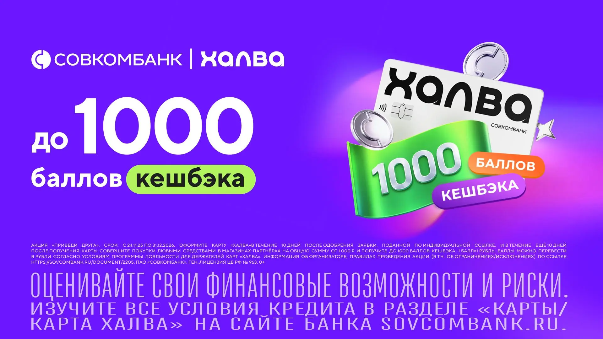 ⚡️ По 31.08.26 клиентам Совкомбанка, у которых карта Халва закрыта от 6 месяцев, доступен бонус 1000 баллов (1б=1₽):