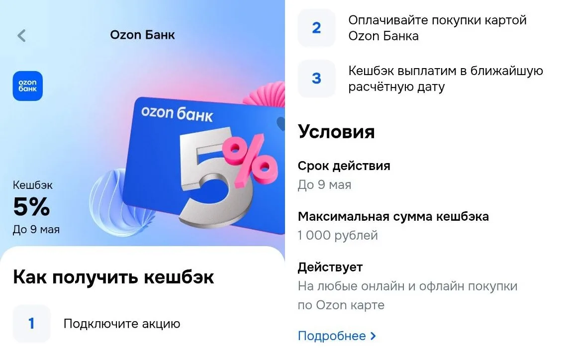 ⚡️ Проверяйте персональные предложения в Озон Банке (Выгода → Акции) – многим выдали кэшбэк 5% на всё в течение месяца, макс 1000₽ (нужно активировать). Причем даже тем, кто воспользовался похожей акцией в марте: