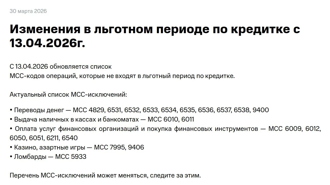 ❗️ С 13.04.26 МТС вносит 9400 (Финуслуги и др. платформы) в список MCC, платежи с которыми приведут к потере грейса по кредиткам. Полный список: 4829, 5933, 6009-6012, 6050, 6051, 6211, 6531-6538, 6540, 7995, 9400, 9406.