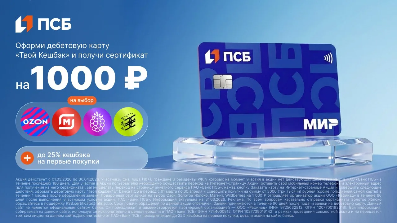 🛒🛒🛍🛍 По этой ссылке — 1000₽ в ЗЯ / Магнит / Озон / WB, если потратить 3000₽ в течение 1 месяца с даты заявки. Для лиц без карт/счетов ПСБ от 180 дней. Придет в смс в течение 60 дней после покупок, для связи: PSB.certificate@rafinad.io. Правила.