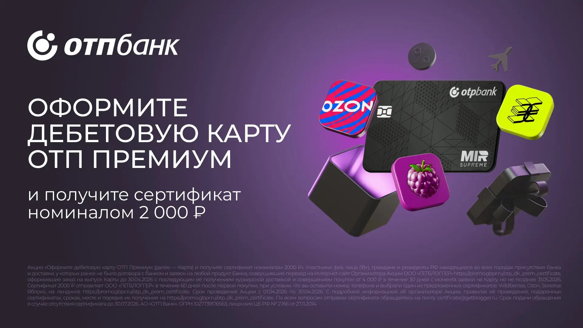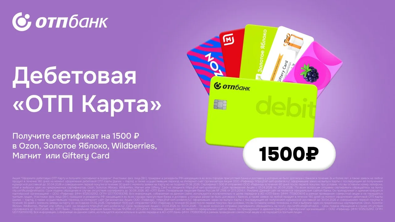 ⚡️ Продлена по 30.04.26 акция по бесплатной дебетовой ОТП Карте с бонусом 1500₽ на выбор – в 🛍Ozon, 🛍WB, 🛒Золотое Яблоко, 🛒Магнит или 🎁Гифтери. Правила.