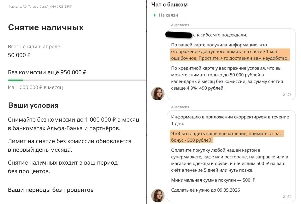 ⚡️ У некоторых клиентов в приложении Альфа-Банка может отображаться ошибочная сумма снятия с кредитки без комиссии в 1млн/мес.