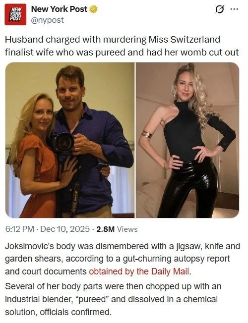 ⚡️Муж убил жену – экс-финалистку конкурса красоты «Мисс Швейцария» Кристину Йоксимович. Затем вырезал у нее матку, а тело измельчил электролобзиком, ножом и садовым секатором. Потом провернул в блендере и растворил в кислоте. Про него пока известно лишь, что ему 43 года и его зовут Томас.
