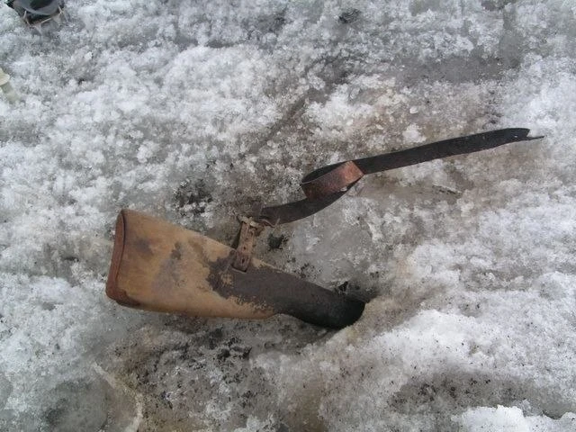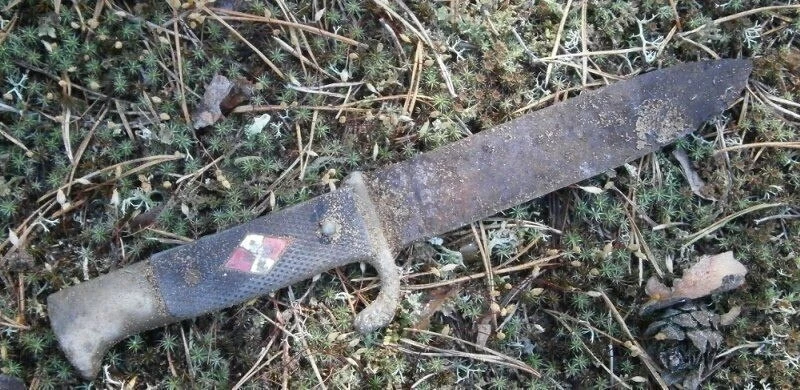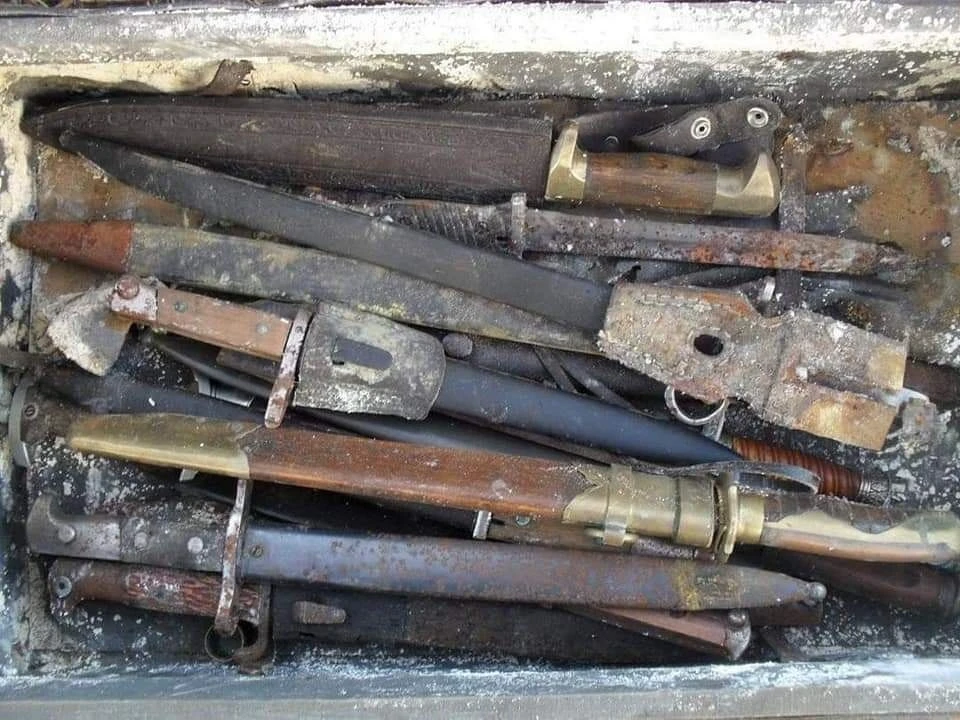 На опушке леса охотниками была обнаружена куча выброшенного оборудования. Разбирая завалы, через какое-то время, они увидели чемодан, в котором находилось 10 немецких штыков и другие ножи...