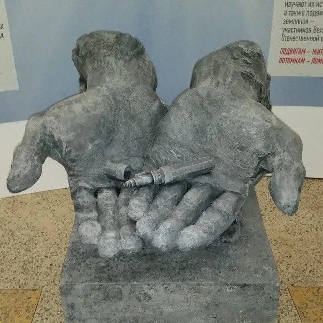 Скульптура называется "Ладони поисковика". Это элемент временной выставки 2015 года, созданной командой "Невский баталист" и открытой в рамках акции "Вахта памяти-2015" в Старой Руссе.
