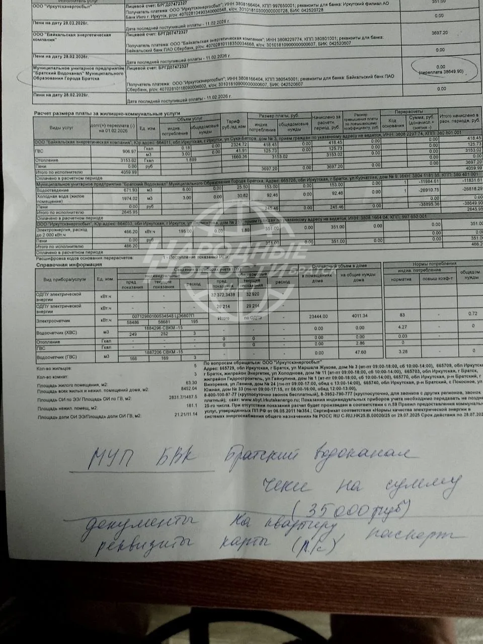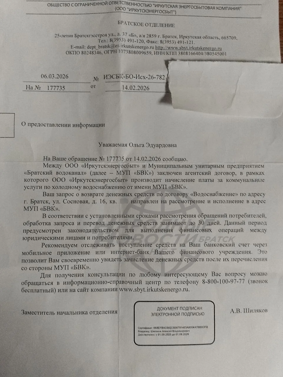 Здравствуйте! Помогите мне пожалуйста в моей ситуации. В феврале месяце я обратилась в Энергетическую компанию, на ул Гайнулина что у меня очень много берут за холодное водоснабжение. Провели сверку и насчитали у меня 38тыс переплаты. В марте месяце мои документы пришли в бухгалтерию братского водоканала. Вот уже 2 месяца я не могу получить свои деньги. Я на пенсии, имею несовершенно летнего ребенка студента.
