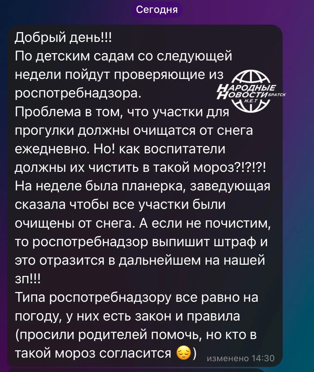 Хотим поблагодарить ваш канал за внимание к нашей работе и важным для города темам, которые вы иногда освещаете. Ваш ресурс действительно доносит народные новости до братчан