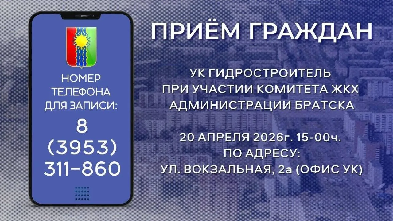 ‼‼ 20 апреля 2026г. в 15:00ч. будет проводиться прием граждан по личным попросам руководителем управляющей компании УК «Гидростроитель» совместно с заместителем председателя комитета ЖКХ по жилищной политике Администрации Братска