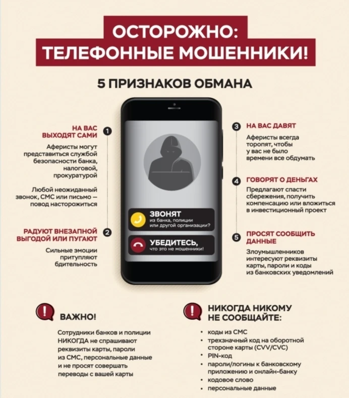 Мошенники часто используют одни и те же схемы, чтобы обмануть доверчивых людей. ⚠️ Они могут представляться сотрудниками банков, служб безопасности или даже родственниками, чтобы получить ваши личные данные или деньги. 💼 Будьте бдительны и не доверяйте незнакомцам по телефону или в интернете! 📵 Никогда не сообщайте свои пароли, коды из смс и данные банковских карт. 🔒 Если что-то кажется подозрительным — лучше перезвоните в официальную организацию и уточните информацию. 📞